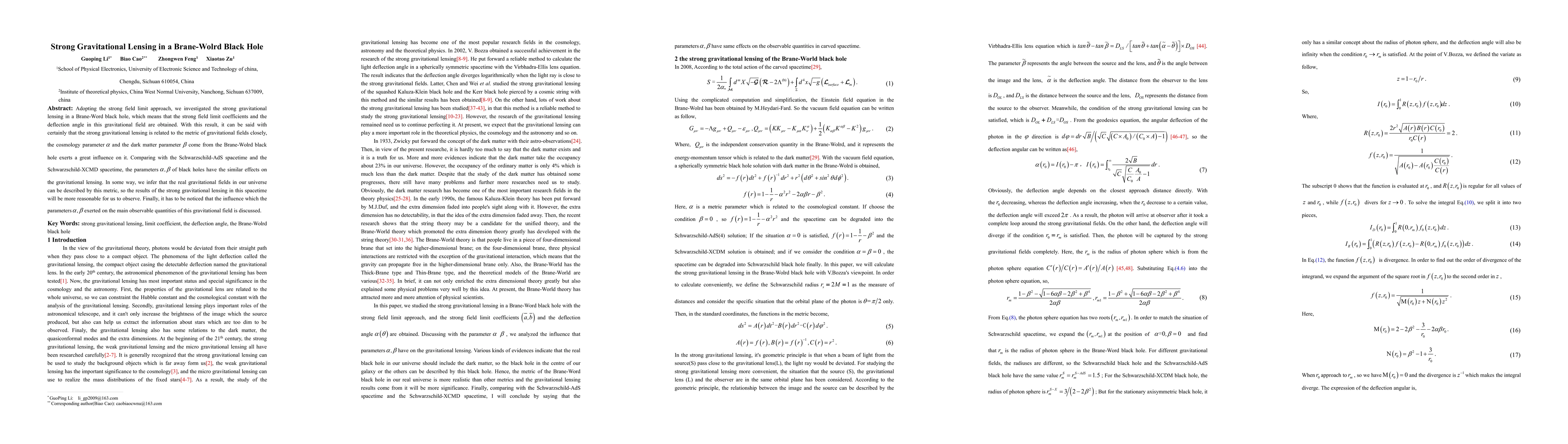 Adopting the strong field limit approach, we investigated the strong gravitational lensing in a Brane-World black hole, which means that the strong field limit coefficients and the deflection angle in this gravitational field are obtained. With this result, it can be said with certainly that the strong gravitational lensing is related to the metric of gravitational fields closely, the cosmology parameter {\alpha} and the dark matter parameter \b{eta} come from the Brane-World black hole exerts a great influence on it. Comparing with the Schwarzschild-AdS spacetime and the Schwarzschild-XCMD spacetime, the parameters {\alpha}, \b{eta} of black holes have the similar effects on the gravitational lensing. In some way, we infer that the real gravitational fields in our universe can be described by this metric, so the results of the strong gravitational lensing in this spacetime will be more reasonable for us to observe. Finally, it has to be noticed that the influence which the parameters {\alpha}, \b{eta} exerted on the main observable quantities of this gravitational field is discussed.