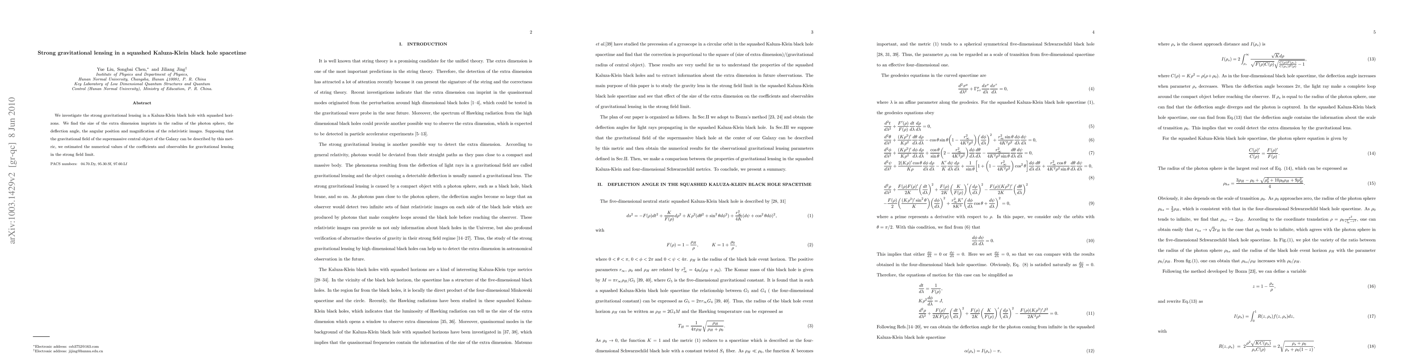 This paper explores strong gravitational lensing in a Kaluza-Klein black hole with squashed horizons, detailing how the extra dimension affects the photon sphere, deflection angle, angular position, and magnification of relativistic images. Numerical values for these lensing observables in the strong field limit are estimated assuming the supermassive galactic object's gravitational field can be modeled by this metric.