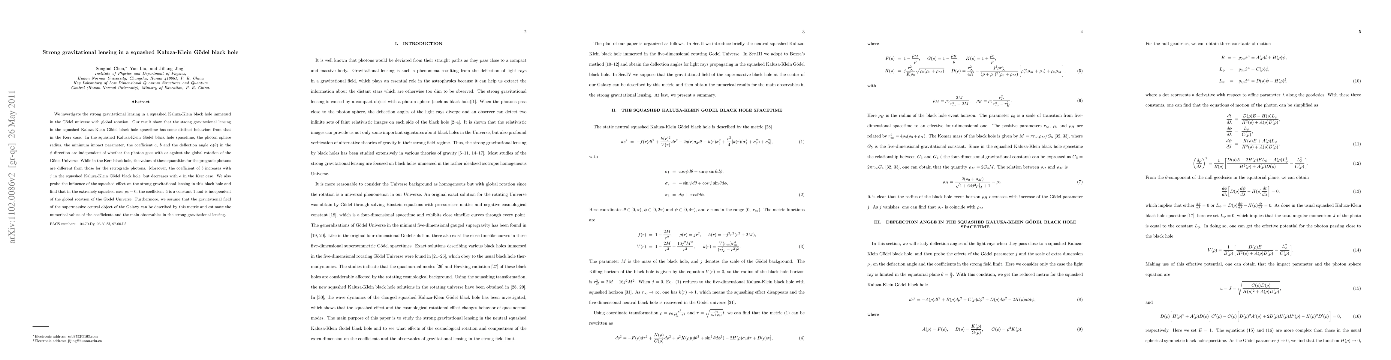 We investigate the strong gravitational lensing in a squashed Kaluza-Klein black hole immersed in the G\"{o}del universe with global rotation. Our result show that the strong gravitational lensing in the squashed Kaluza-Klein G\"{o}del black hole spacetime has some distinct behaviors from that in the Kerr case. In the squashed Kaluza-Klein G\"{o}del black hole spacetime, the photon sphere radius, the minimum impact parameter, the coefficient $\bar{a}$, $\bar{b}$ and the deflection angle $\alpha(\theta)$ in the $\phi$ direction are independent of whether the photon goes with or against the global rotation of the G\"{o}del Universe. While in the Kerr black hole, the values of these quantities for the prograde photons are different from those for the retrograde photons. Moreover, the coefficient of $\bar{b}$ increases with $j$ in the squashed Kaluza-Klein G\"{o}del black hole, but decreases with $a$ in the Kerr case. We also probe the influence of the squashed effect on the strong gravitational lensing in this black hole and find that in the extremely squashed case $\rho_0=0$, the coefficient $\bar{a}$ is a constant 1 and is independent of the global rotation of the G\"{o}del Universe. Furthermore, we assume that the gravitational field of the supermassive central object of the Galaxy can be described by this metric and estimate the numerical values of the coefficients and the main observables in the strong gravitational lensing.