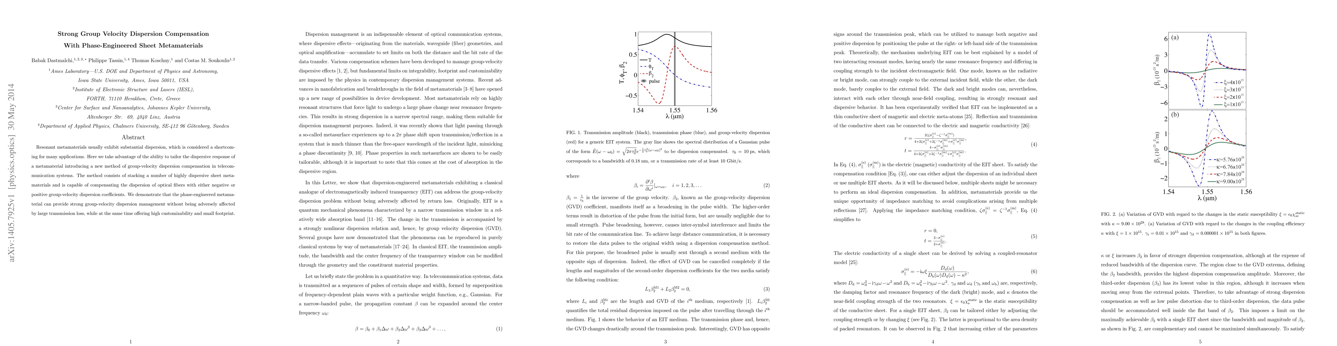 This paper proposes a novel method for strong group-velocity dispersion compensation using phase-engineered sheet metamaterials, which can effectively manage dispersion in optical fibers without significant transmission loss, offering high customizability and a compact design. The stacked metamaterials provide a versatile solution for telecommunication systems.