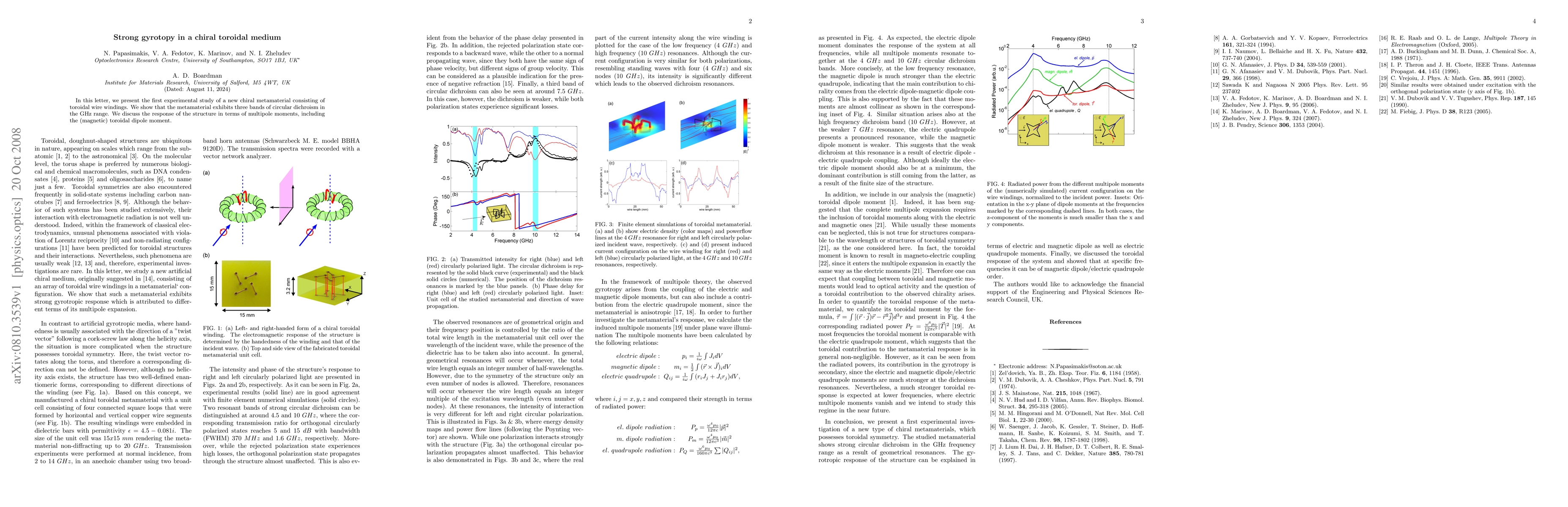 In this letter, we present the first experimental study of a new chiral metamaterial consisting of toroidal wire windings. We show that the metamaterial exhibits three bands of circular dichroism in the GHz range. We discuss the response of the structure in terms of multipole moments, including the (magnetic) toroidal dipole moment.