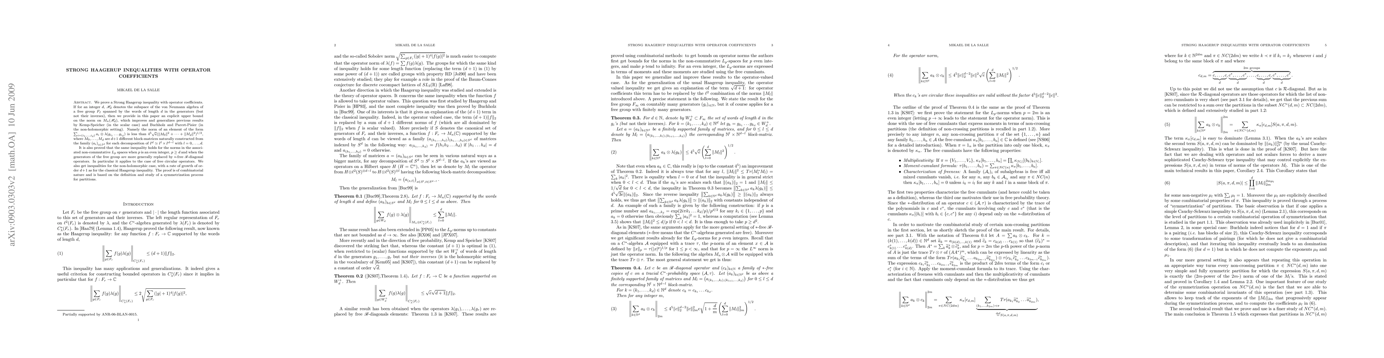 We prove a Strong Haagerup inequality with operator coefficients. If for an integer d, H_d denotes the subspace of the von Neumann algebra of a free group F_I spanned by the words of length d in the generators (but not their inverses), then we provide in this paper an explicit upper bound on the norm on M_n(H_d), which improves and generalizes previous results by Kemp-Speicher (in the scalar case) and Buchholz and Parcet-Pisier (in the non-holomorphic setting). Namely the norm of an element of the form $\sum_{i=(i_1,..., i_d)} a_i \otimes \lambda(g_{i_1} ... g_{i_d})$ is less than $4^5 \sqrt e (\|M_0\|^2+...+\|M_d\|^2)^{1/2}$, where M_0,...,M_d are d+1 different block-matrices naturally constructed from the family (a_i)_{i \in I^d} for each decomposition of I^d = I^l \times I^{d-l} with l=0,...,d. It is also proved that the same inequality holds for the norms in the associated non-commutative L_p spaces when p is an even integer, p>d and when the generators of the free group are more generally replaced by *-free R-diagonal operators. In particular it applies to the case of free circular operators. We also get inequalities for the non-holomorphic case, with a rate of growth of order d+1 as for the classical Haagerup inequality. The proof is of combinatorial nature and is based on the definition and study of a symmetrization process for partitions.