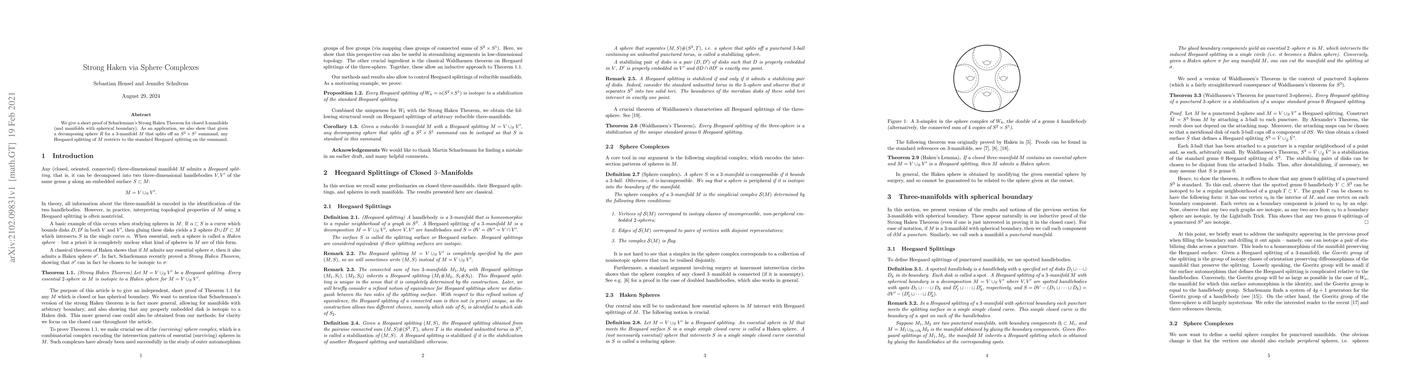 Researchers prove Scharlemann's Strong Haken Theorem for closed 3-manifolds, showing that a specific decomposition restricts to a standard Heegaard splitting on summands.