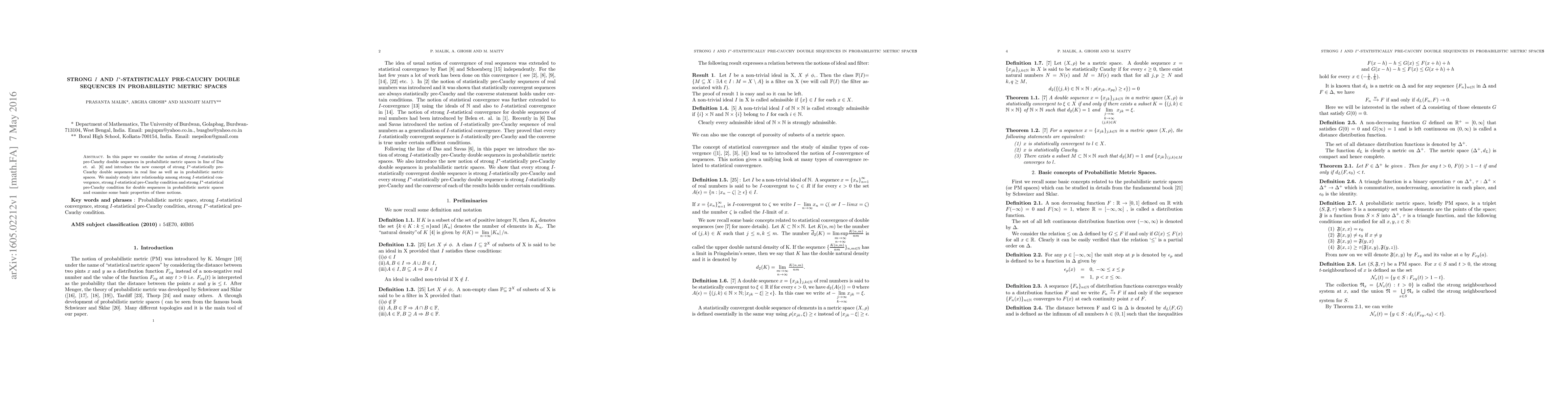 The paper introduces and studies the concepts of strong $I$-statistically pre-Cauchy and strong $I^*$-statistically pre-Cauchy double sequences in probabilistic metric spaces, examining their relationships and properties.
