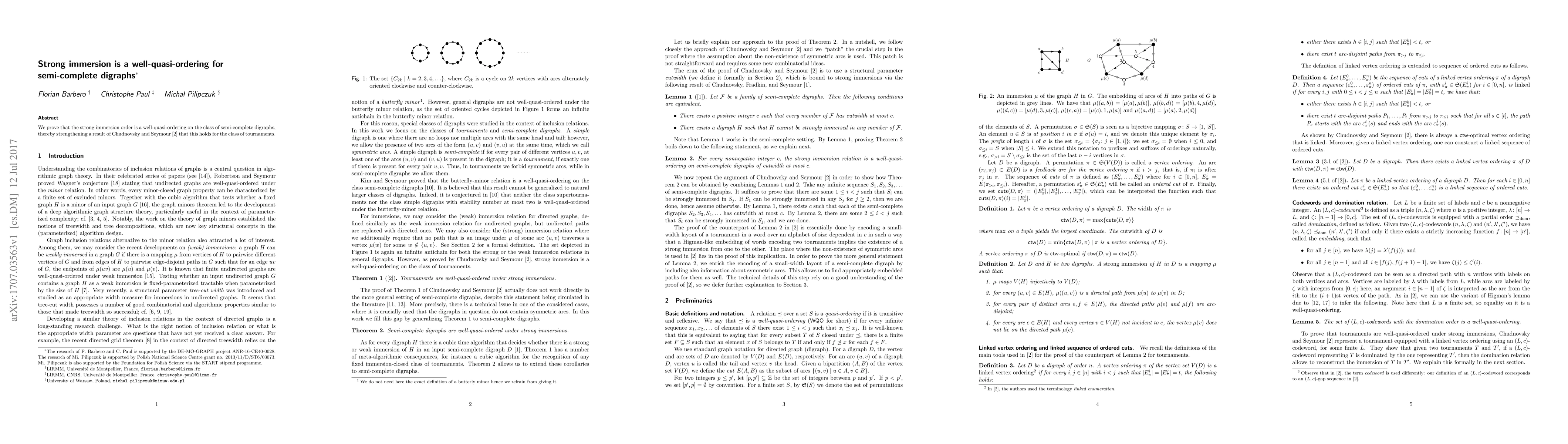 Summary: This paper demonstrates that the strong immersion order is a well-quasi-ordering for semi-complete digraphs, extending a previous result by Chudnovsky and Seymour for tournaments. This finding enhances our understanding of structural properties in directed graph theory.