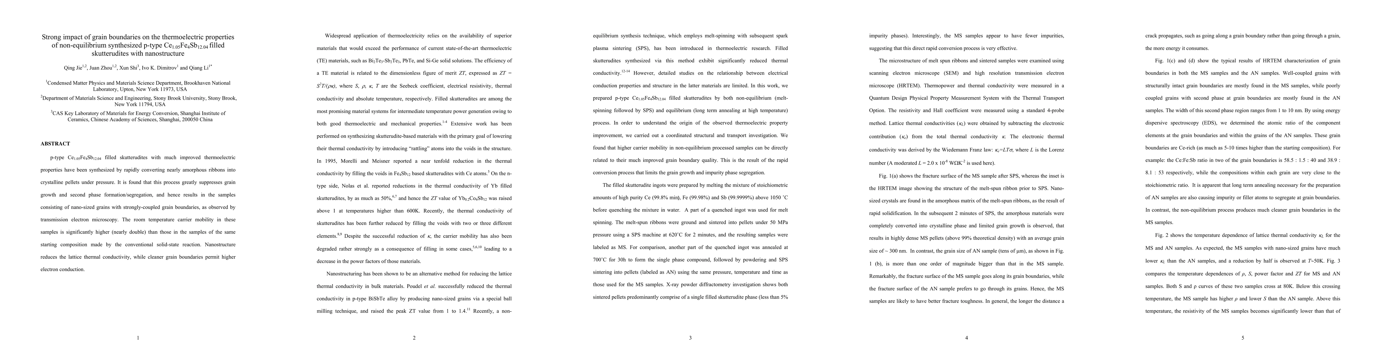 p-type Ce1.05Fe4Sb12.04 filled skutterudites with much improved thermoelectric properties have been synthesized by rapidly converting nearly amorphous ribbons into crystalline pellets under pressure. It is found that this process greatly suppresses grain growth and second phase formation/segregation, and hence results in the samples consisting of nano-sized grains with strongly-coupled grain boundaries, as observed by transmission electron microscopy. The room temperature carrier mobility in these samples is significantly higher (nearly double) than those in the samples of the same starting composition made by the conventional solid-state reaction. Nanostructure reduces the lattice thermal conductivity, while cleaner grain boundaries permit higher electron conduction.