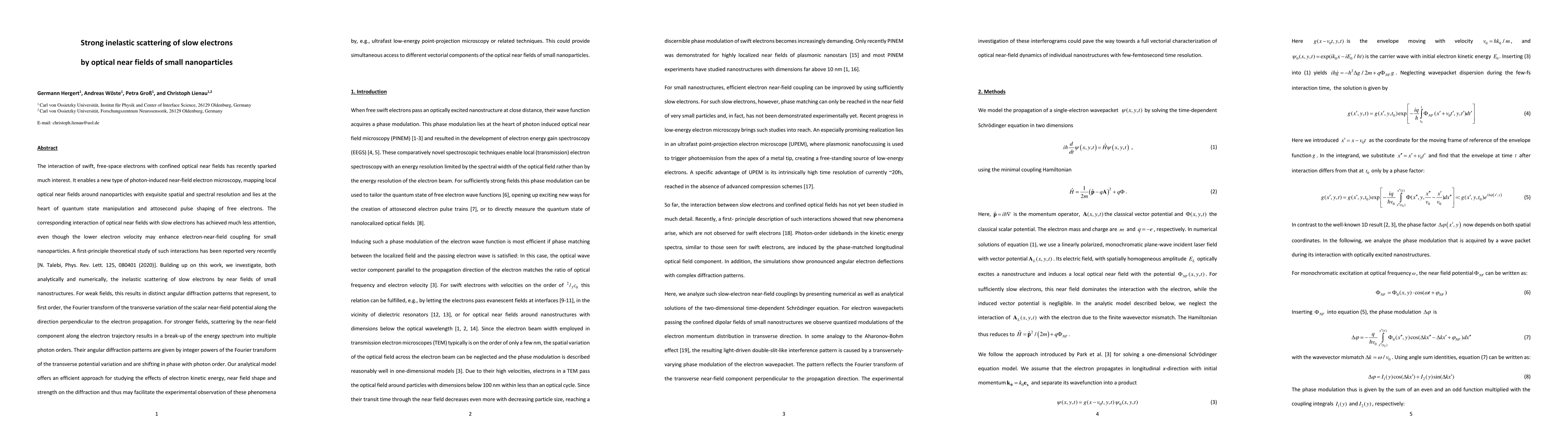This paper investigates the inelastic scattering of slow electrons by optical near fields of small nanoparticles, revealing distinct angular diffraction patterns and energy spectrum breakups into multiple photon orders. The study provides an analytical model to understand the effects of electron kinetic energy and near-field characteristics, potentially aiding experimental techniques like ultrafast low-energy microscopy.