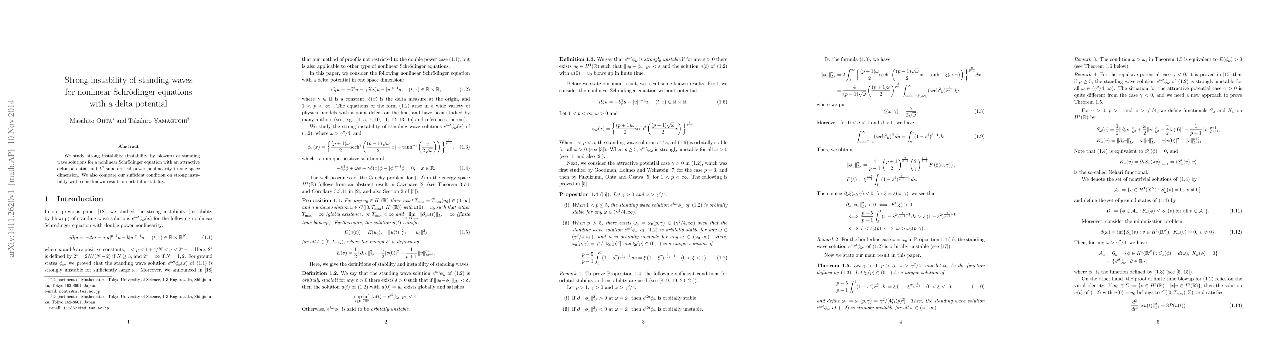 Summary: This paper investigates the strong instability of standing wave solutions for a nonlinear Schrödinger equation with an attractive delta potential and $L^2$-supercritical nonlinearity, demonstrating blowup instability and comparing it with known orbital instability results.