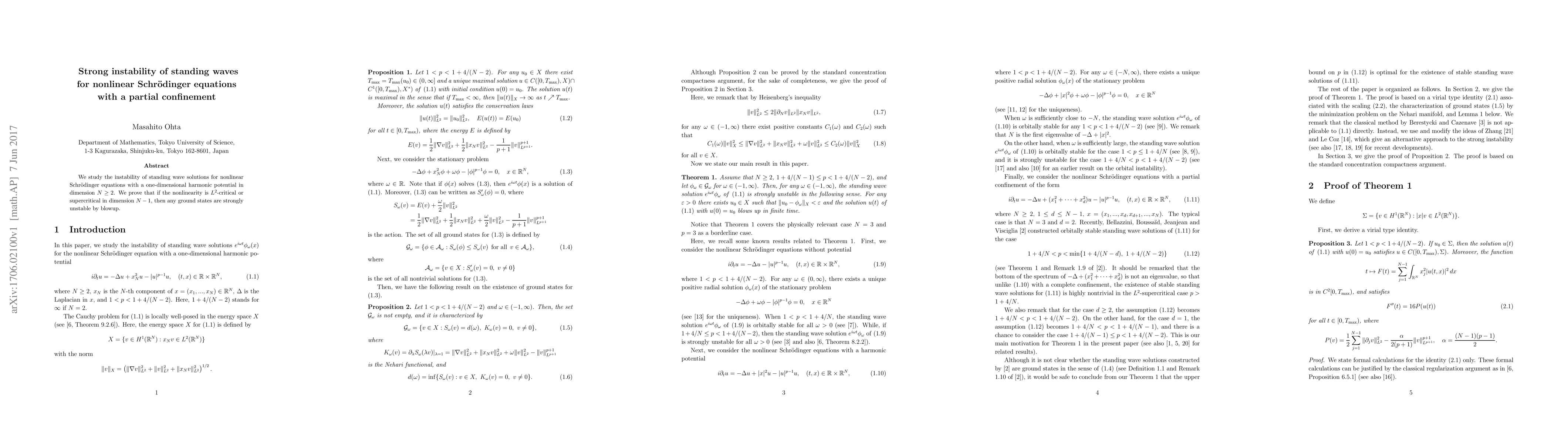 This paper investigates the instability of standing wave solutions for nonlinear Schrödinger equations under partial confinement, showing that ground states are strongly unstable and undergo blowup when the nonlinearity is $L^2$-critical or supercritical in dimensions $N-1$ for $N \geq 2$.