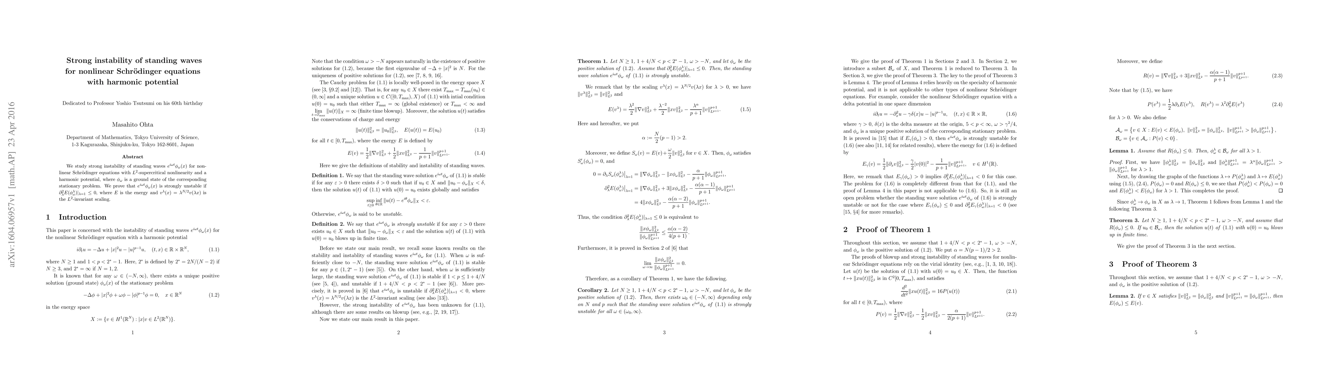 This paper investigates the strong instability of standing wave solutions for nonlinear Schrödinger equations with harmonic potential and $L^2$-supercritical nonlinearity. The authors prove that standing waves $e^{i\omega t} \phi_{\omega}(x)$ are strongly unstable if the second derivative of the energy functional with respect to scaling parameter $\lambda$ at $\lambda=1$ is nonpositive.