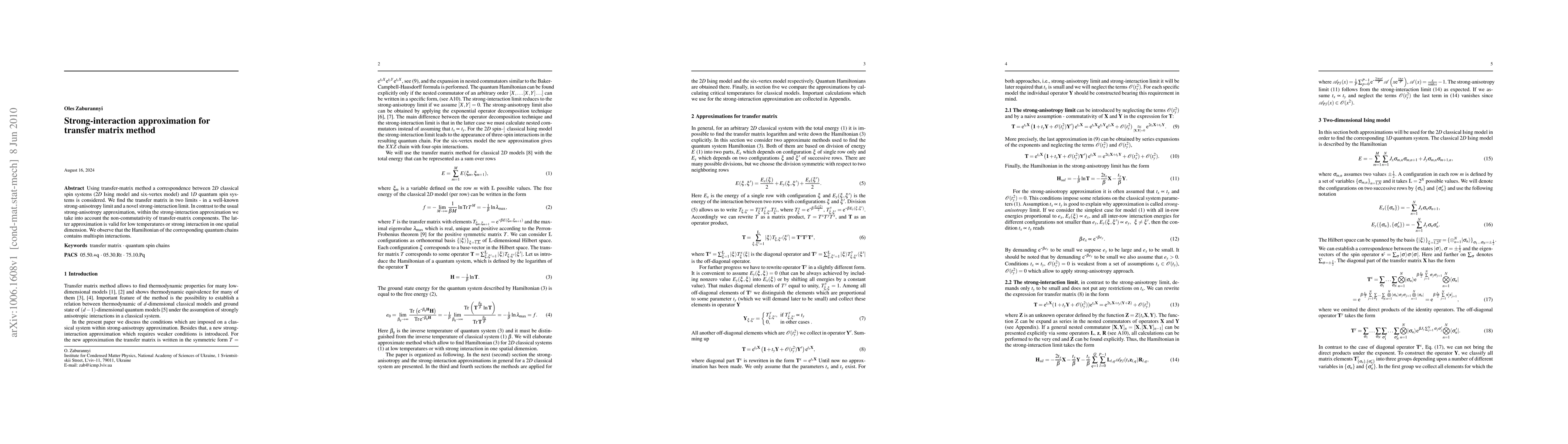 Using transfer-matrix method a correspondence between $2D$ classical spin systems ($2D$ Ising model and six-vertex model) and $1D$ quantum spin systems is considered. We find the transfer matrix in two limits - in a well-known strong-anisotropy limit and a novel strong-interaction limit. In contrast to the usual strong-anisotropy approximation, within the strong-interaction approximation we take into account the non-commutativity of transfer-matrix components. The latter approximation is valid for low temperatures or strong interaction in one spatial dimension. We observe that the Hamiltonian of the corresponding quantum chains contains multispin interactions.
