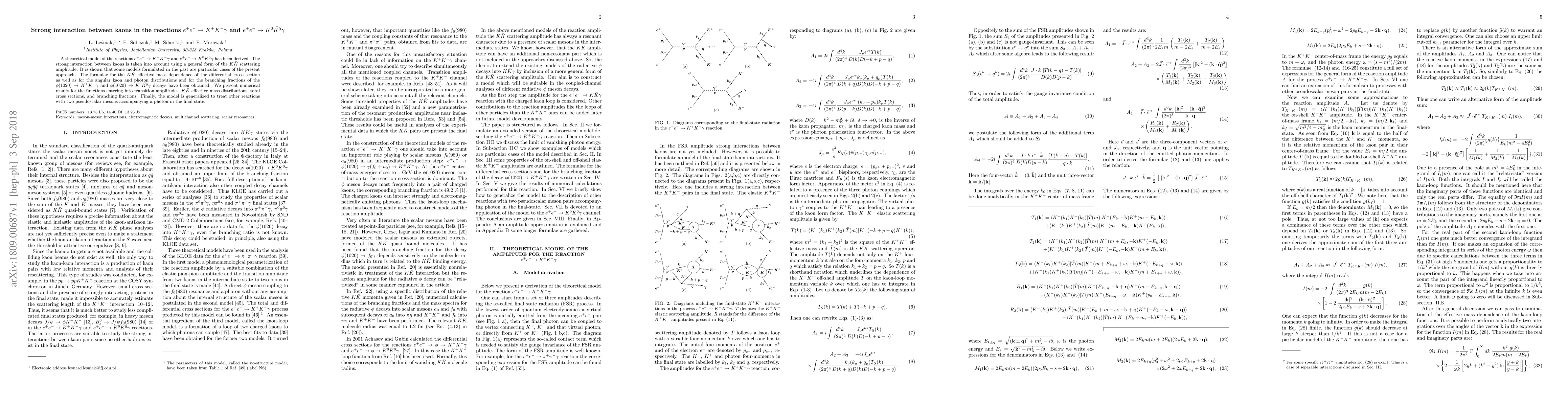 A theoretical model explains strong interaction between kaons in e+e- reactions involving gamma, providing formulas for differential cross sections, angular distributions, and branching fractions, with implications for understanding particle decays.