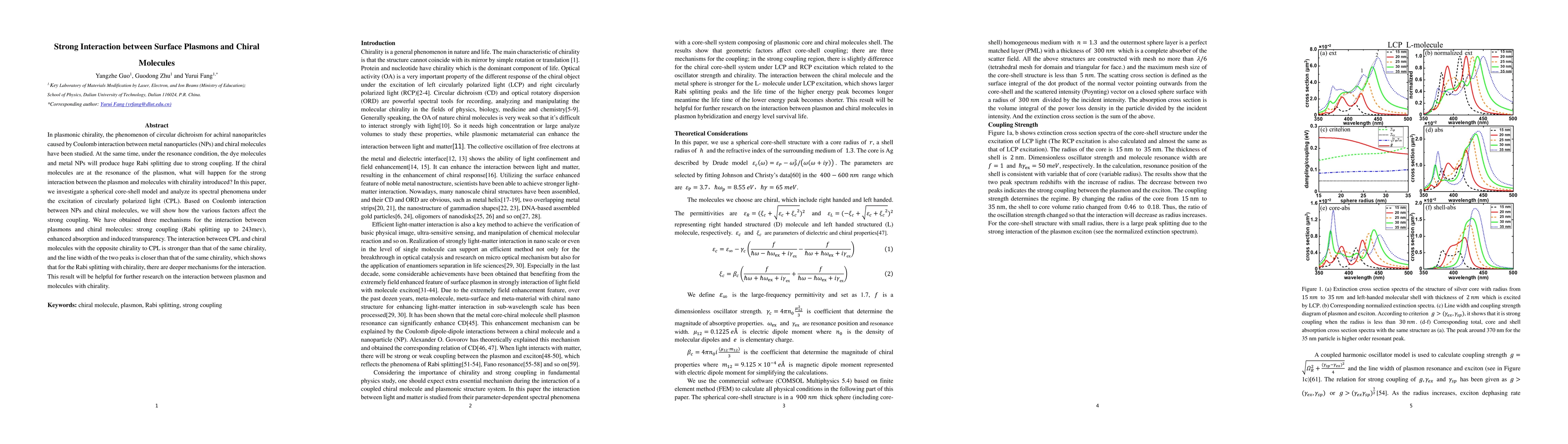 This paper investigates the strong interaction between surface plasmons and chiral molecules in a spherical core-shell model under circularly polarized light excitation. The study reveals three mechanisms: strong coupling (Rabi splitting up to 243 meV), enhanced absorption, and induced transparency, with opposite chirality interactions exhibiting stronger coupling and narrower spectral peaks.