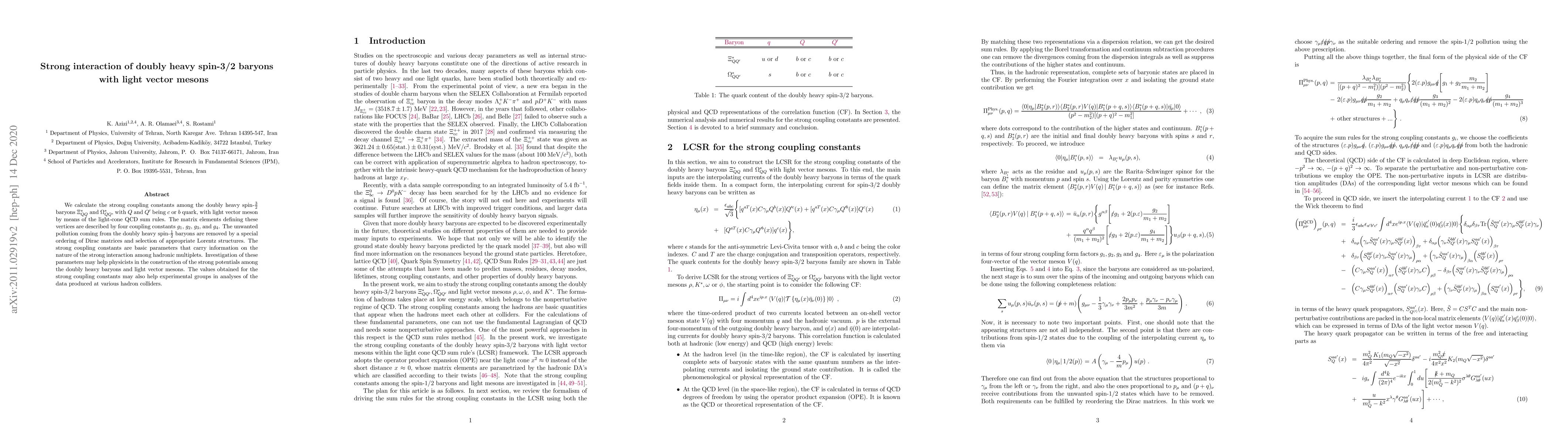 This paper calculates the strong coupling constants for interactions between doubly heavy spin-3/2 baryons, specifically $\Xi^*_{QQ}$ and $\Omega^*_{QQ}$, and light vector mesons using light-cone QCD sum rules. The study identifies four coupling constants and excludes contamination from spin-1/2 baryons, providing essential data for understanding the strong interaction dynamics and aiding experimental analyses at hadron colliders.