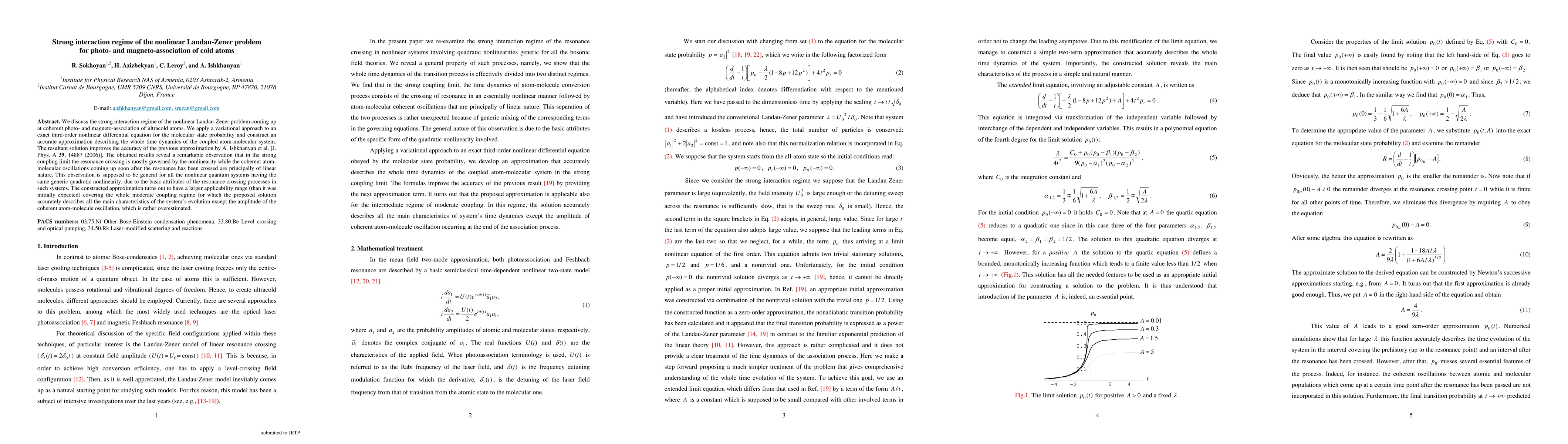 We discuss the strong interaction regime of the nonlinear Landau-Zener problem coming up at coherent photo- and magneto-association of ultracold atoms. We apply a variational approach to an exact third-order nonlinear differential equation for the molecular state probability and construct an accurate approximation describing the whole time dynamics of the coupled atom-molecular system. The resultant solution improves the accuracy of the previous approximation by A. Ishkhanyan et al. [J. Phys. A 39, 14887 (2006)]. The obtained results reveal a remarkable observation that in the strong coupling limit the resonance crossing is mostly governed by the nonlinearity while the coherent atom-molecular oscillations coming up soon after the resonance has been crossed are principally of linear nature. This observation is supposed to be general for all the nonlinear quantum systems having the same generic quadratic nonlinearity, due to the basic attributes of the resonance crossing processes in such systems. The constructed approximation turns out to have a larger applicability range (than it was initially expected) covering the whole moderate coupling regime for which the proposed solution accurately describes all the main characteristics of the system's evolution except the amplitude of the coherent atom-molecule oscillation, which is rather overestimated.