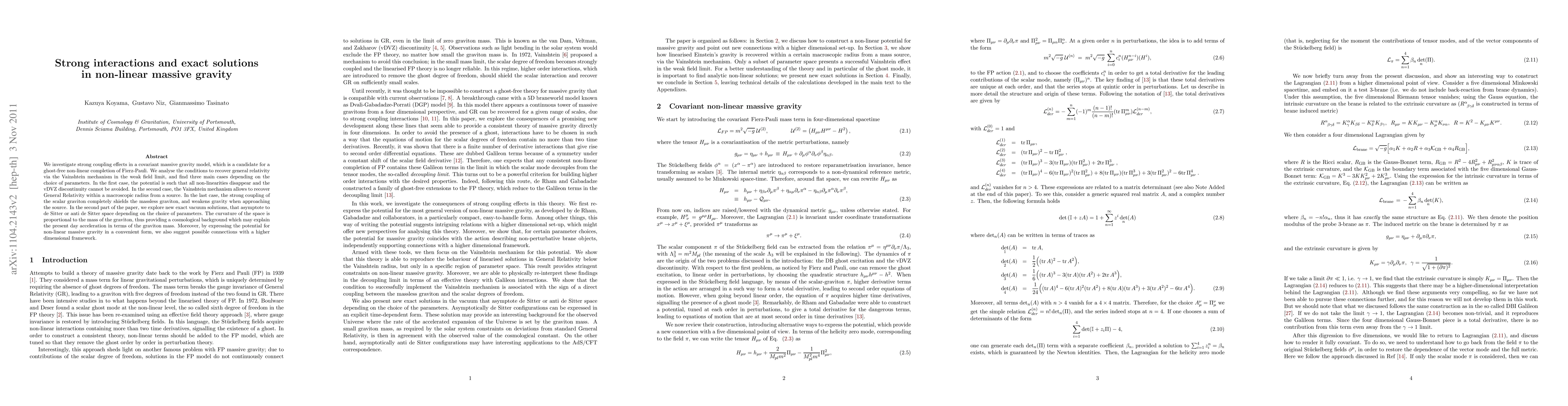 This paper explores strong coupling effects in covariant massive gravity, identifying three main scenarios based on parameter choices, and examines the Vainshtein mechanism for recovering general relativity. It also presents new exact vacuum solutions, suggesting a cosmological background that could explain current acceleration through the graviton mass.