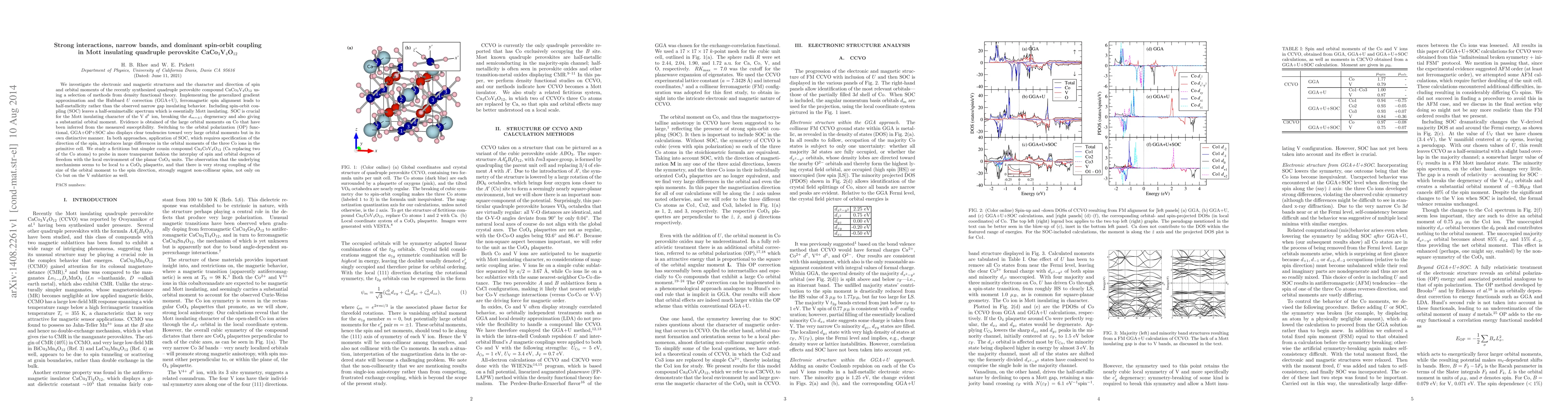 We investigate the electronic and magnetic structures and the character and direction of spin and orbital moments of the recently synthesized quadruple perovskite cobaltovanadate CaCo3V4O12 using a selection of methods from density functional theory. Implementing the generalized gradient approximation and the Hubbard U correction (GGA+U), ferromagnetic spin alignment leads to half-metallicity rather than the observed narrow gap insulating behavior. Including spin-orbit coupling (SOC) leaves a half-semimetallic spectrum which is essentially Mott insulating. SOC is crucial for the Mott insulating character of the V d^1 ion, breaking the d_{m=\pm 1} degeneracy and also giving a substantial orbital moment. Evidence is obtained of the large orbital moments on Co that have been inferred from the measured susceptibility. Switching to the orbital polarization (OP) functional, GGA+OP+SOC also displays clear tendencies toward very large orbital moments but in its own distinctive manner. In both approaches, application of SOC, which requires specification of the direction of the spin, introduces large differences in the orbital moments of the three Co ions in the primitive cell. We study a fictitious but simpler cousin compound Ca3CoV4O12 (Ca replacing two of the Co atoms) to probe in more transparent fashion the interplay of spin and orbital degrees of freedom with the local environment of the planar CoO4 units. The observation that the underlying mechanisms seems to be local to a CoO4 plaquette, and that there is very strong coupling of the size of the orbital moment to the spin direction, strongly suggest non-collinear spins, not only on Co but on the V sublattice as well.