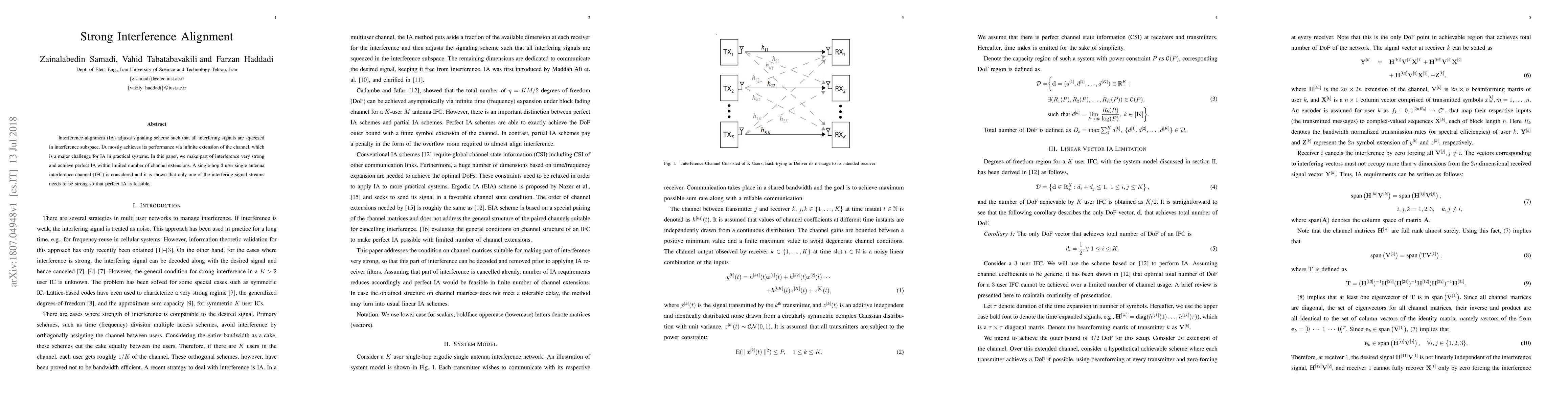 Researchers demonstrate that perfect interference alignment is achievable in a single-hop 3-user single-antenna channel with only one strong interfering signal stream. This breakthrough expands the feasibility of interference alignment in practical systems.