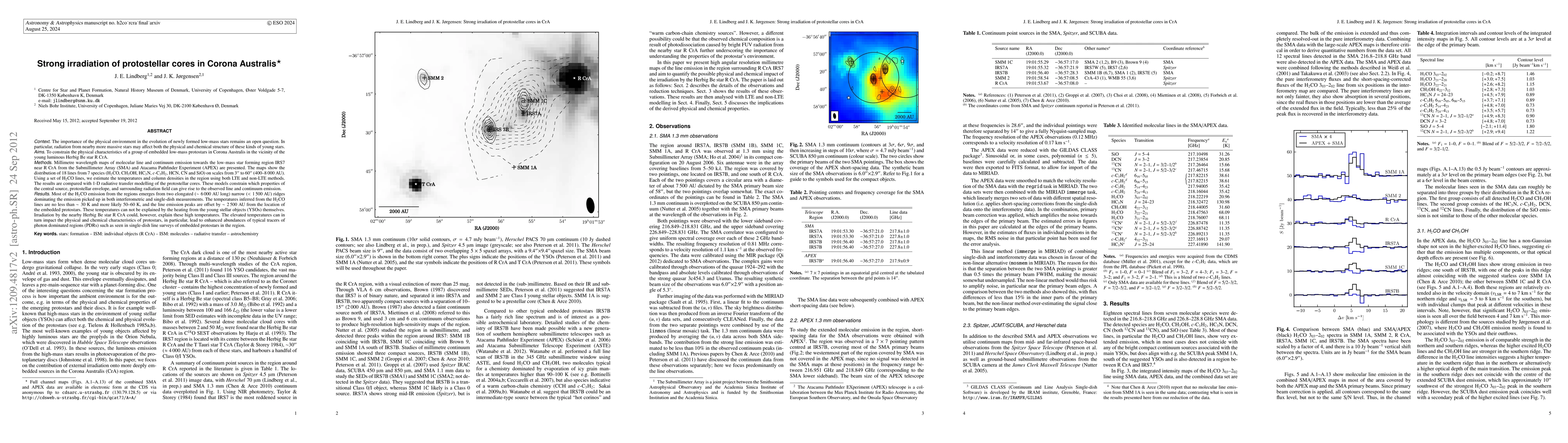 The importance of the physical environment in the evolution of newly formed low-mass stars remains an open question. In particular, radiation from nearby more massive stars may affect both the physical and chemical structure of these kinds of young stars. Aims: To constrain the physical characteristics of a group of embedded low-mass protostars in Corona Australis in the vicinity of the young luminous Herbig Be star R CrA. Methods: Millimetre wavelength maps of molecular line and continuum emission towards the low-mass star forming region IRS7 near R CrA from the SMA and APEX are presented. The maps show the distribution of 18 lines from 7 species (H2CO, CH3OH, HC3N, c-C3H2, HCN, CN and SiO) on scales from 3" to 60" (400-8000 AU). Using a set of H2CO lines, we estimate the temperatures and column densities in the region using LTE and non-LTE methods. The results are compared with 1-D radiative transfer modelling of the protostellar cores. These models constrain which properties of the central source, envelope, and environment can give rise to the observed line and continuum emission. Results: Most of the H2CO emission from the regions emerges from two elongated narrow ridges dominating the emission picked up in both interferometric and single-dish measurements. The temperatures inferred from the H2CO lines are no less than ~30 K and more likely 50-60 K, and the line emission peaks are offset by ~2500 AU from the location of the embedded protostars. The temperatures can not be explained by the heating from the young stellar objects themselves. Irradiation by the nearby Herbig Be star R CrA could, however, explain the high temperatures. The elevated temperatures can in turn impact the physical and chemical characteristics of protostars and lead to enhanced abundances of typical tracers of photon dominated regions seen in single-dish line surveys of embedded protostars in the region.
