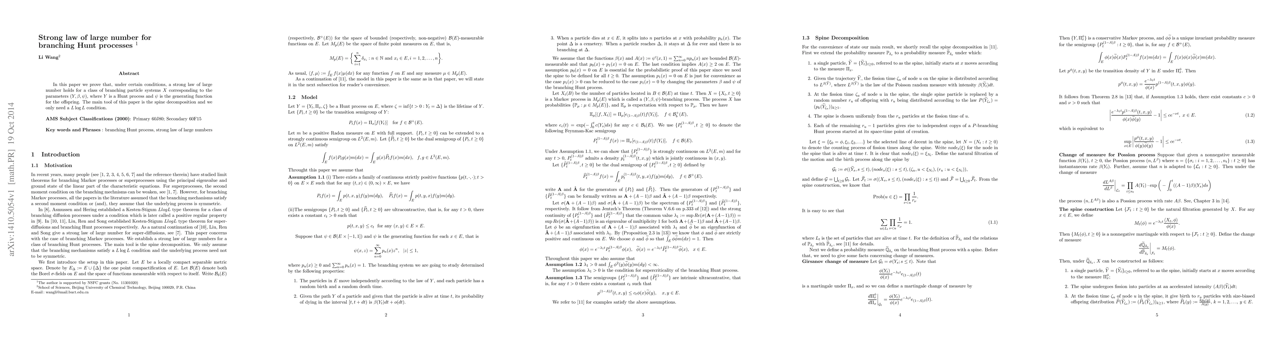 This paper establishes a strong law of large numbers for branching particle systems $X$ associated with parameters $(Y,\beta,\psi)$, where $Y$ is a Hunt process and $\psi$ is an offspring generating function. The proof leverages spine decomposition and requires only an $L\log L$ condition.