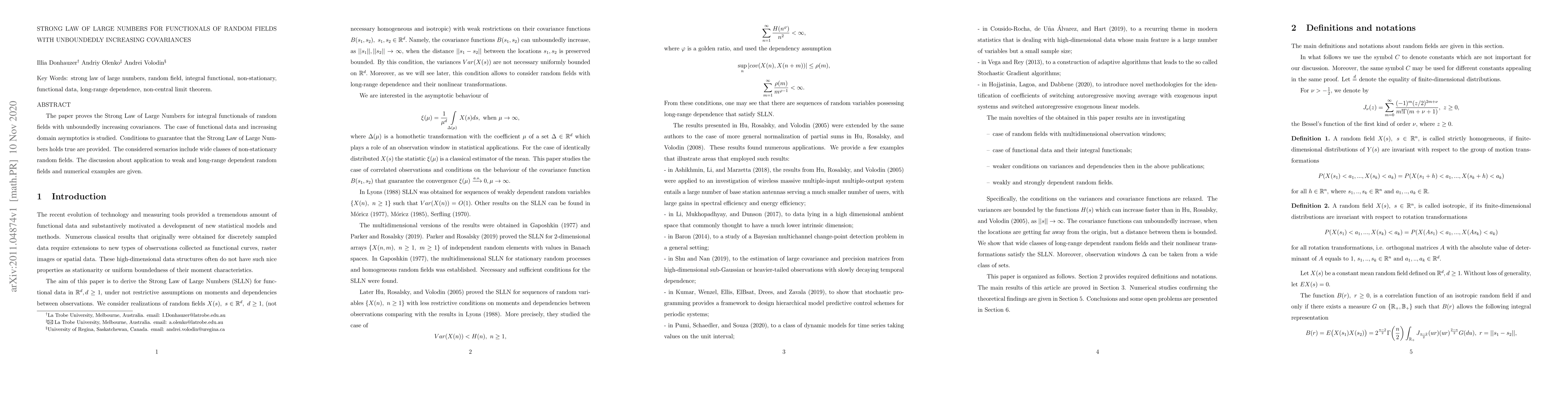The paper establishes the Strong Law of Large Numbers for integral functionals of random fields with unboundedly increasing covariances, providing conditions for its validity and discussing applications to non-stationary, weak, and long-range dependent random fields. Numerical examples illustrate the theoretical findings.