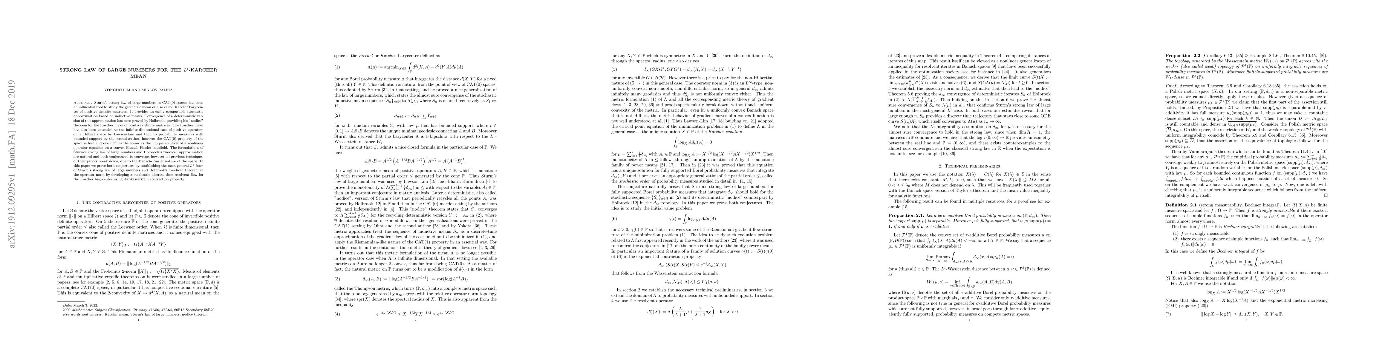 Sturm's strong law of large numbers in $\mathrm{CAT}(0)$ spaces has been an influential tool to study the geometric mean or also called Karcher barycenter of positive definite matrices. It provides an easily computable stochastic approximation based on inductive means. Convergence of a deterministic version of this approximation has been proved by Holbrook, providing his "nodice" theorem for the Karcher mean of positive definite matrices. The Karcher mean has also been extended to the infinite dimensional case of positive operators on a Hilbert space by Lawson-Lim and then to probability measures with bounded support by the second author, however the $\mathrm{CAT}(0)$ property of the space is lost and one defines the mean as the unique solution of a nonlinear operator equation on a convex Banach-Finsler manifold. The formulations of Sturm's strong law of large numbers and Holbrook's "nodice" approximation are natural and both conjectured to converge, however all previous techniques of their proofs break down, due to the Banach-Finsler nature of the space. In this paper we prove both conjectures by establishing the most general $L^1$-form of Sturm's strong law of large numbers and Holbrook's "nodice" theorem in the operator norm by developing a stochastic discrete-time resolvent flow for the Karcher barycenter using its Wasserstein contraction property.
