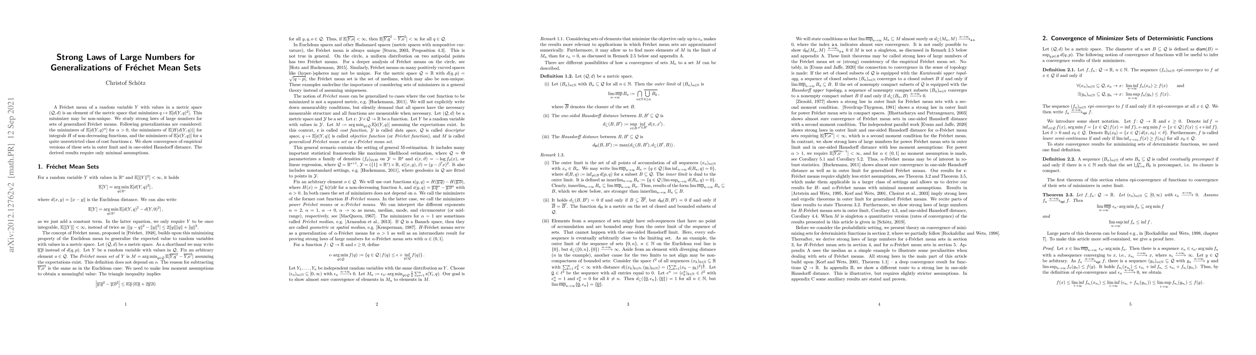 A Fr\'echet mean of a random variable $Y$ with values in a metric space $(\mathcal Q, d)$ is an element of the metric space that minimizes $q \mapsto \mathbb E[d(Y,q)^2]$. This minimizer may be non-unique. We study strong laws of large numbers for sets of generalized Fr\'echet means. Following generalizations are considered: the minimizers of $\mathbb E[d(Y, q)^\alpha]$ for $\alpha > 0$, the minimizers of $\mathbb E[H(d(Y, q))]$ for integrals $H$ of non-decreasing functions, and the minimizers of $\mathbb E[\mathfrak c(Y, q)]$ for a quite unrestricted class of cost functions $\mathfrak c$. We show convergence of empirical versions of these sets in outer limit and in one-sided Hausdorff distance. The derived results require only minimal assumptions.