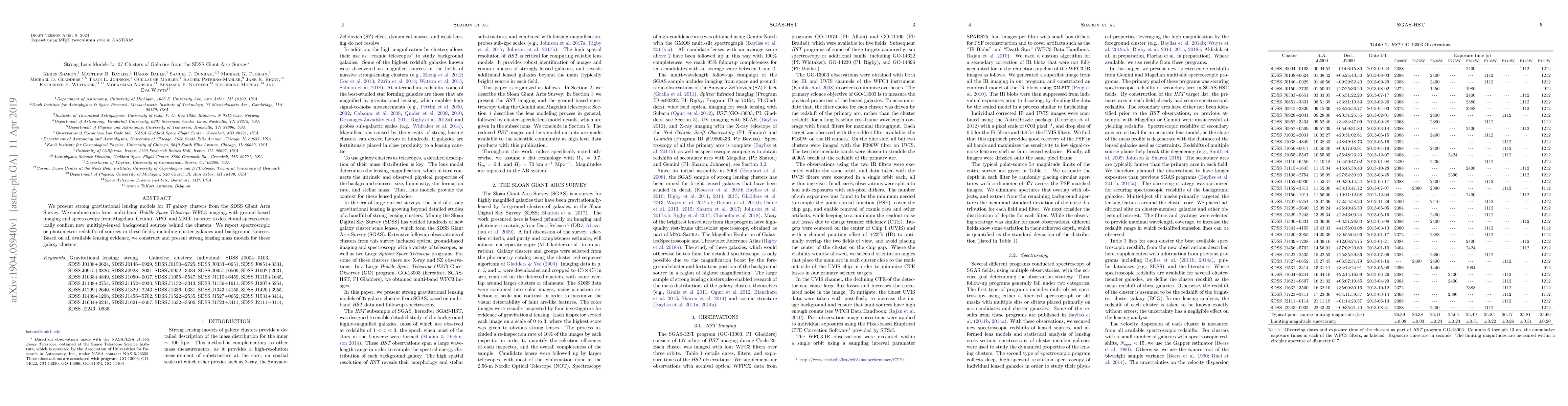 We present strong gravitational lensing models for 37 galaxy clusters from the SDSS Giant Arcs Survey. We combine data from multi-band Hubble Space Telescope WFC3imaging, with ground-based imaging and spectroscopy from Magellan, Gemini, APO, and MMT, in order to detect and spectroscopically confirm new multiply-lensed background sources behind the clusters. We report spectroscopic or photometric redshifts of sources in these fields, including cluster galaxies and background sources. Based on all available lensing evidence, we construct and present strong lensing mass models for these galaxy clusters.