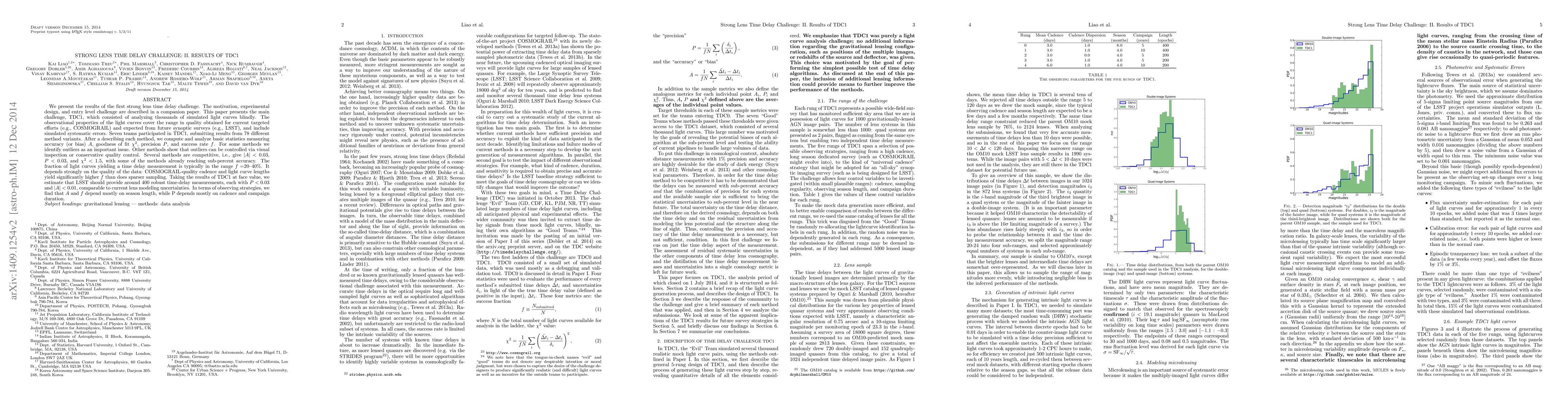 This paper reports on the first strong lens time delay challenge, TDC1, where teams analyzed simulated light curves to determine time delays. Results show competitive methods achieving sub-percent accuracy, with LSST expected to yield around 400 robust time-delay measurements. Observing strategies significantly impact accuracy, success rate, and precision.