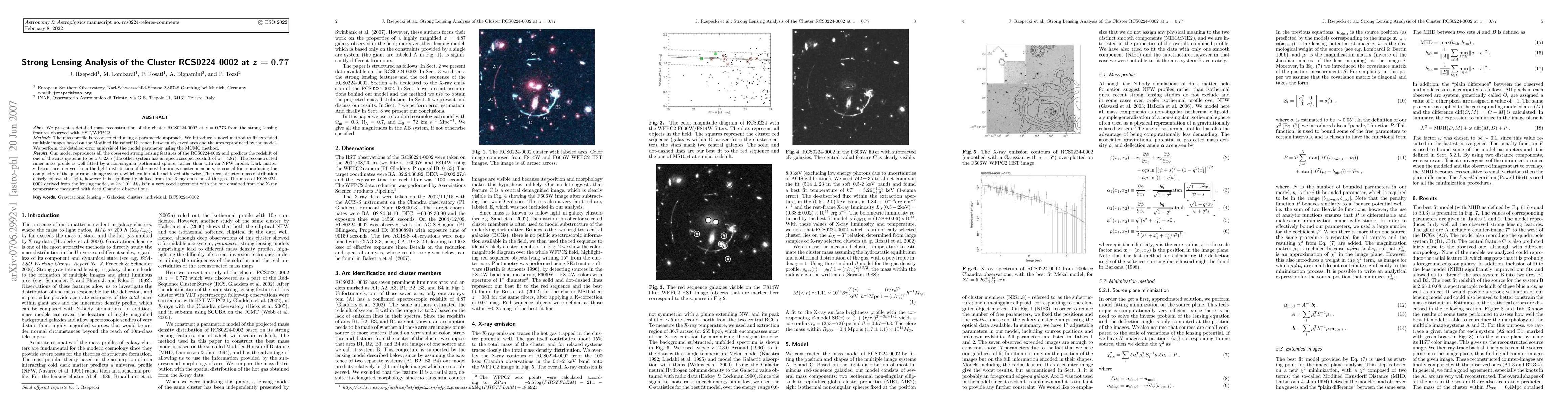 This research details a strong lensing analysis of the distant cluster RCS0224-0002 at $z=0.77$. Utilizing HST/WFPC2, a novel method based on Modified Hausdorff Distance was applied to reconstruct the mass profile. The study finds that a non-singular isothermal sphere model best fits the inner mass, while dark matter substructure is essential for explaining complex lensing features. The mass, $approx 2 imes10^{14} M_odot$, aligns with X-ray temperature measurements from Chandra observations, indicating consistency in mass estimation methods.