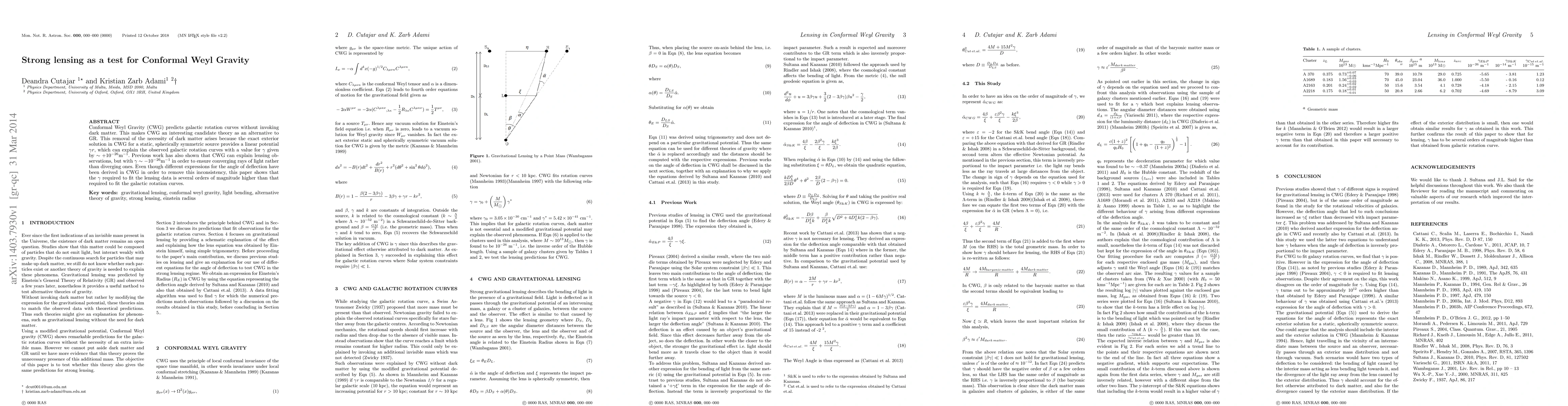 This paper investigates the use of strong lensing as a test for Conformal Weyl Gravity (CWG) as an alternative to General Relativity, finding that the value of $\gamma$ required to fit lensing data is significantly higher than that needed to explain galactic rotation curves, suggesting a potential inconsistency in CWG's predictions.