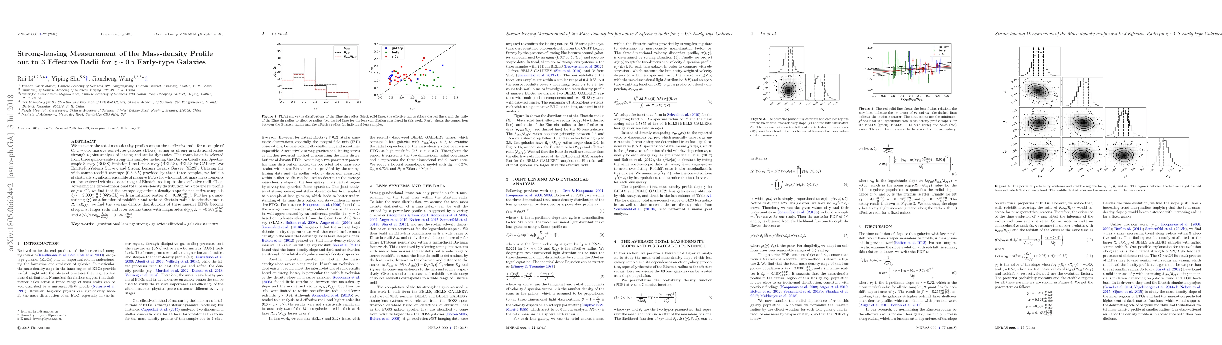 We measure the total mass-density profiles out to three effective radii for a sample of 63 $z \sim 0.5$, massive early-type galaxies (ETGs) acting as strong gravitational lenses through a joint analysis of lensing and stellar dynamics. The compilation is selected from three galaxy-scale strong-lens samples including the Baryon Oscillation Spectroscopic Survey (BOSS) Emission-Line Lens Survey (BELLS), BELLS for GALaxy-Ly$\alpha$ EmitteR sYstems Survey, and Strong Lensing Legacy Survey (SL2S). Utilizing the wide source-redshift coverage (0.8--3.5) provided by these three samples, we build a statistically significant ensemble of massive ETGs for which robust mass measurements can be achieved within a broad range of Einstein radii up to three effective radii. Characterizing the three-dimensional total mass-density distribution by a power-law profile as $\rho \propto r^{-\gamma}$, we find that the average logarithmic density slope for the entire sample is $\langle\gamma\rangle=2.000_{-0.032}^{+0.033}$ ($68\%$CL) with an intrinsic scatter $\delta=0.180_{-0.028}^{+0.032}$. Further parameterizing $\langle\gamma\rangle$ as a function of redshift $z$ and ratio of Einstein radius to effective radius $R_{ein}/R_{eff}$, we find the average density distributions of these massive ETGs become steeper at larger radii and later cosmic times with magnitudes $\mathrm{d} \langle\gamma\rangle / \mathrm{d}z = -0.309_{-0.160}^{+0.166}$ and $\mathrm{d} \langle\gamma\rangle / \mathrm{d} \log_{10} \frac{R_{ein}}{R_{eff}} = 0.194_{-0.083}^{+0.092}$.