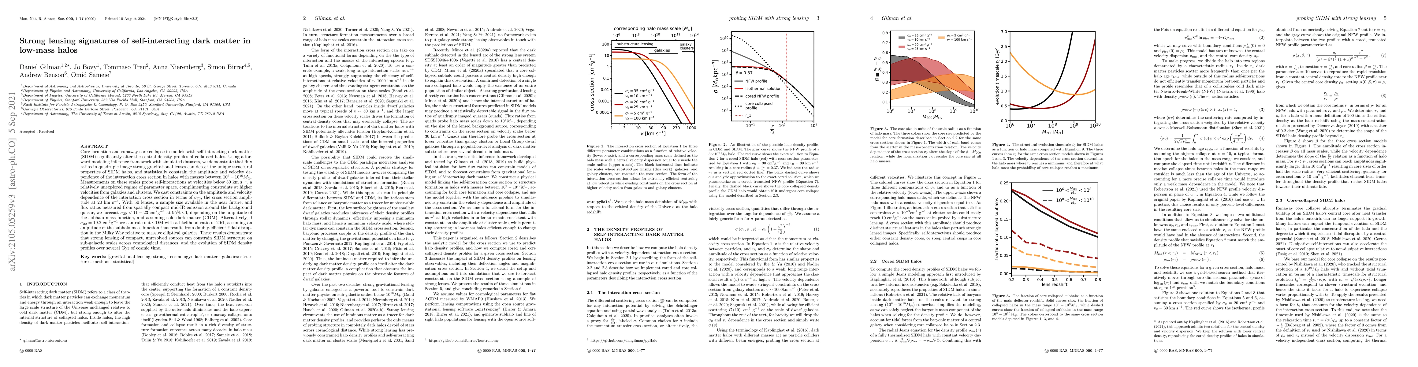 This paper demonstrates that strong lensing signatures in quadruple image gravitational lenses can detect and statistically constrain the unique structural properties of self-interacting dark matter (SIDM) halos, particularly in low-mass halos. The study forecasts that with a sample of 50 lenses, the interaction cross section amplitude at 20 km/s can be constrained, potentially ruling out cold dark matter models.