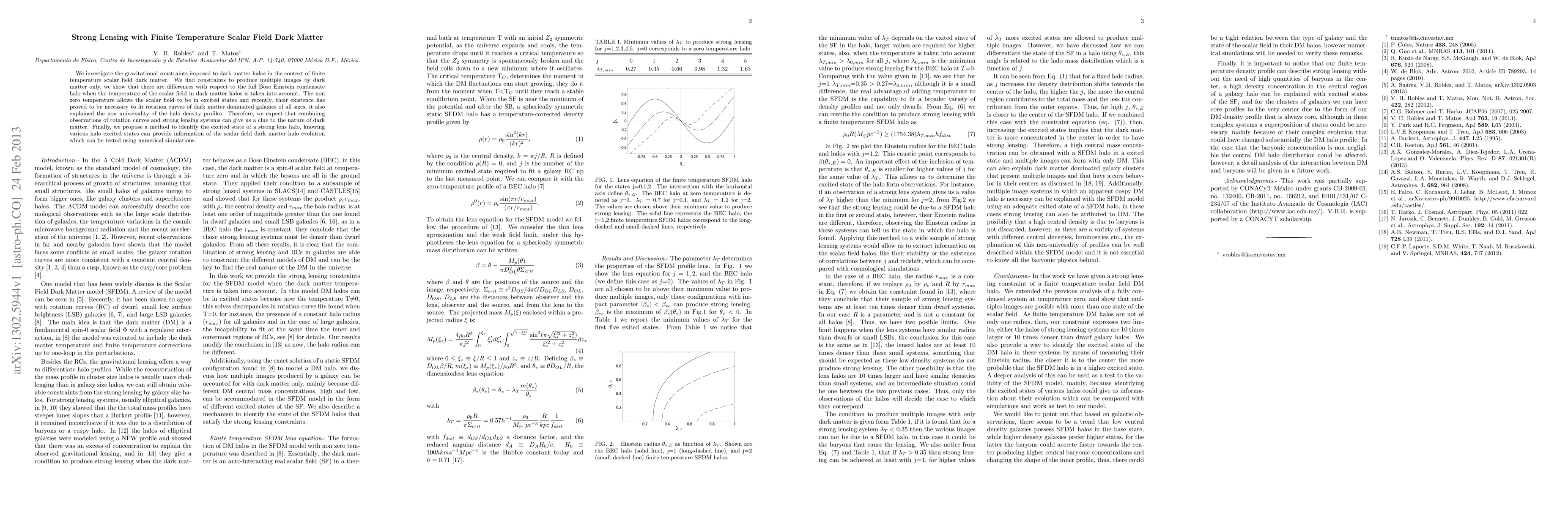 We investigate the gravitational constraints imposed to dark matter halos in the context of finite temperature scalar field dark matter. We find constraints to produce multiple images by dark matter only, we show that there are differences with respect to the full Bose Einstein condensate halo when the temperature of the scalar field in dark matter halos is taken into account. The non zero temperature allows the scalar field to be in excited states and recently, their existence has proved to be necessary to fit rotation curves of dark matter dominated galaxies of all sizes, it also explained the non universality of the halo density profiles. Therefore, we expect that combining observations of rotation curves and strong lensing systems can give us a clue to the nature of dark matter. Finally, we propose a method to identify the excited state of a strong lens halo, knowing various halo excited states can provide information of the scalar field dark matter halo evolution which can be tested using numerical simulations.