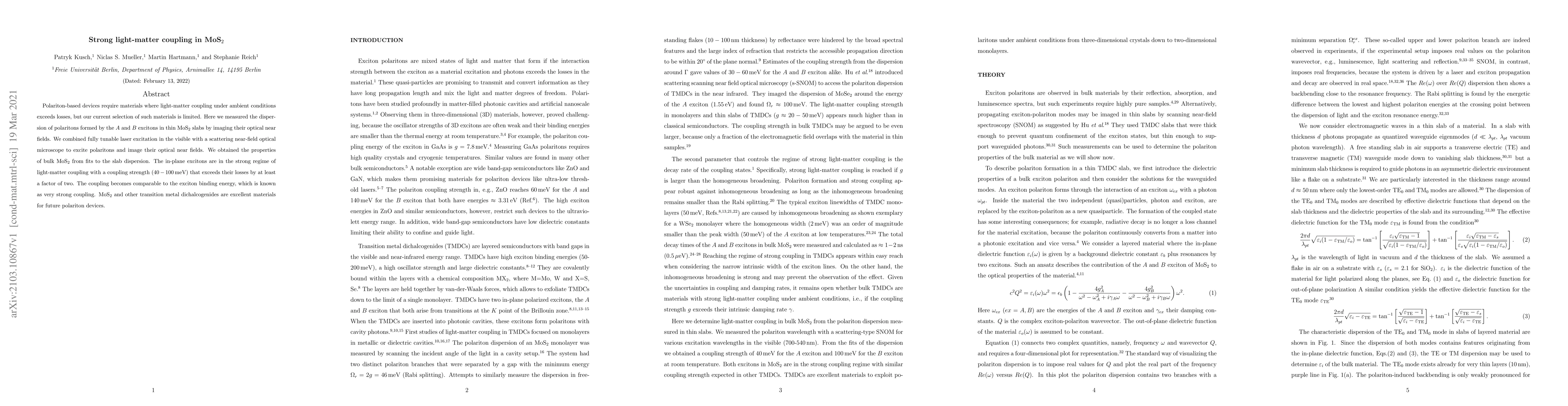 Researchers found that MoS$_2$ exhibits strong light-matter coupling in its excitons, exceeding losses by a factor of two, making it an excellent material for future polariton devices.