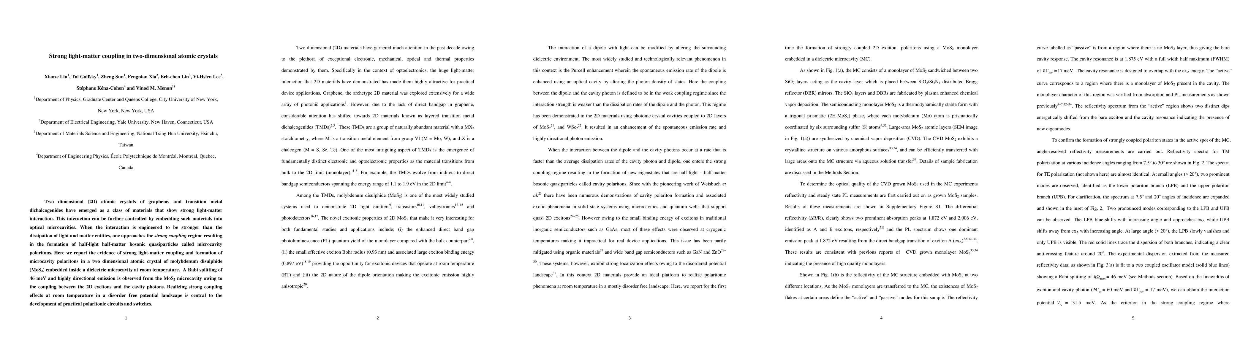 This paper reports the strong light-matter coupling and formation of microcavity polaritons in molybdenum disulphide (MoS2) embedded in a dielectric microcavity, demonstrating a Rabi splitting of 46 meV and directional emission at room temperature, which is essential for practical polaritonic devices.