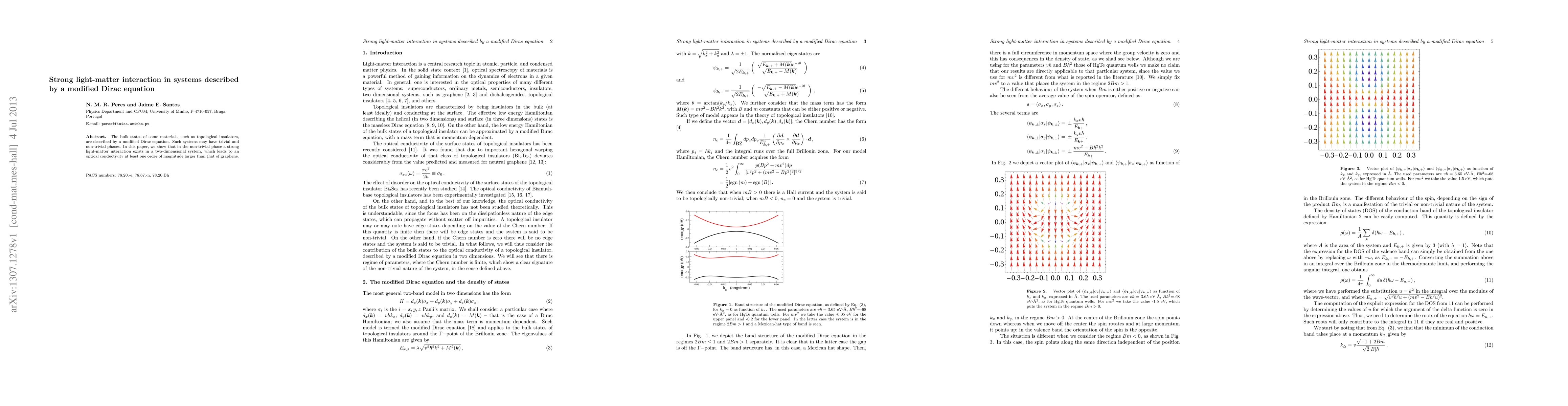 The bulk states of some materials, such as topological insulators, are described by a modified Dirac equation. Such systems may have trivial and non-trivial phases. In this paper, we show that in the non-trivial phase a strong light-matter interaction exists in a two-dimensional system, which leads to an optical conductivity at least one order of magnitude larger than that of graphene.