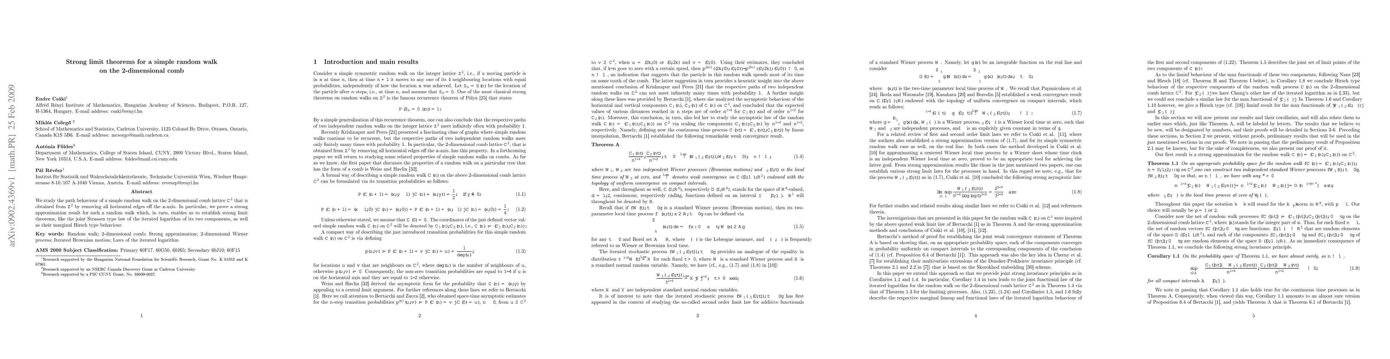 Researchers study a 2D random walk on a comb lattice and prove strong limit theorems for its path behavior, enabling approximations and laws of large numbers.