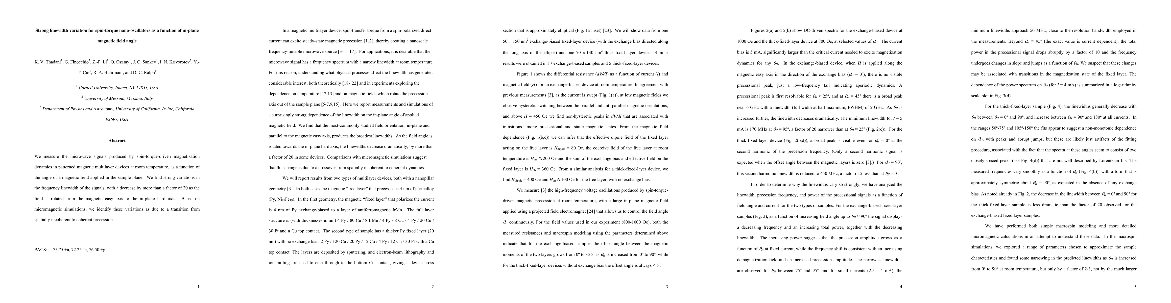 We measure the microwave signals produced by spin-torque-driven magnetization dynamics in patterned magnetic multilayer devices at room temperature, as a function of the angle of a magnetic field applied in the sample plane. We find strong variations in the frequency linewidth of the signals, with a decrease by more than a factor of 20 as the field is rotated from the magnetic easy axis to the in-plane hard axis. Based on micromagnetic simulations, we identify these variations as due to a transition from spatially incoherent to coherent precession.