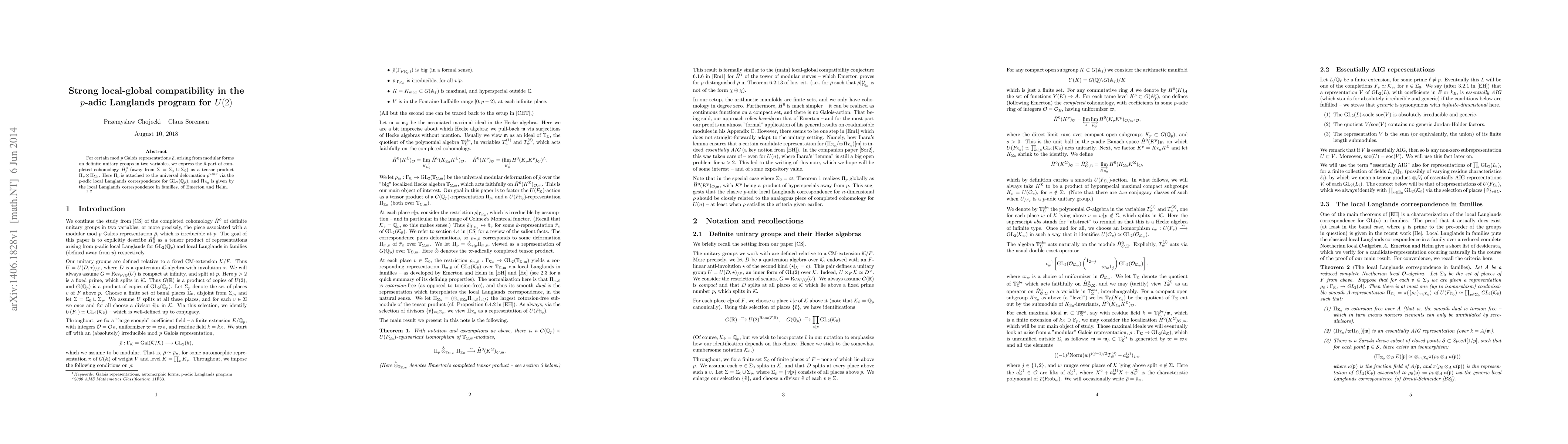 Summary: This paper demonstrates strong local-global compatibility in the p-adic Langlands program for U(2) by showing that certain Galois-isotypic parts of the completed cohomology group can be expressed as a completed tensor product of representations from both the p-adic Langlands correspondence for $GL_2(\mathbb{Q}_p)$ and the local Langlands correspondence in families of Emerton and Helm.