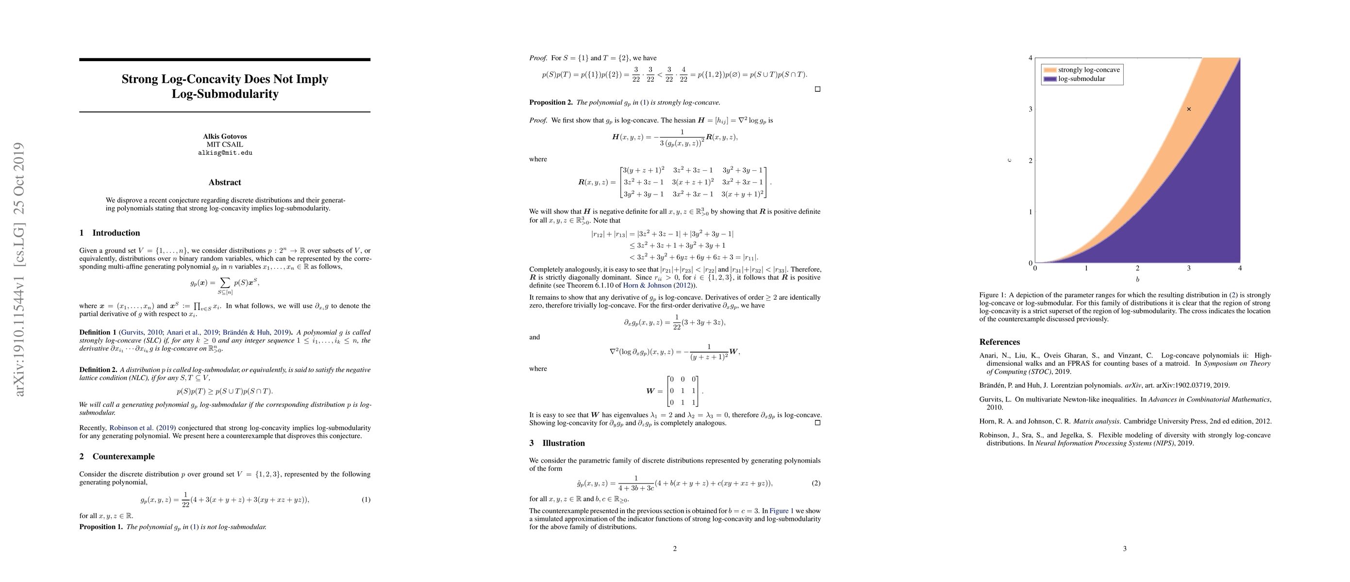 Summary: This paper refutes a conjecture that strong log-concavity in discrete distributions leads to log-submodularity, demonstrating that these properties are not equivalent.