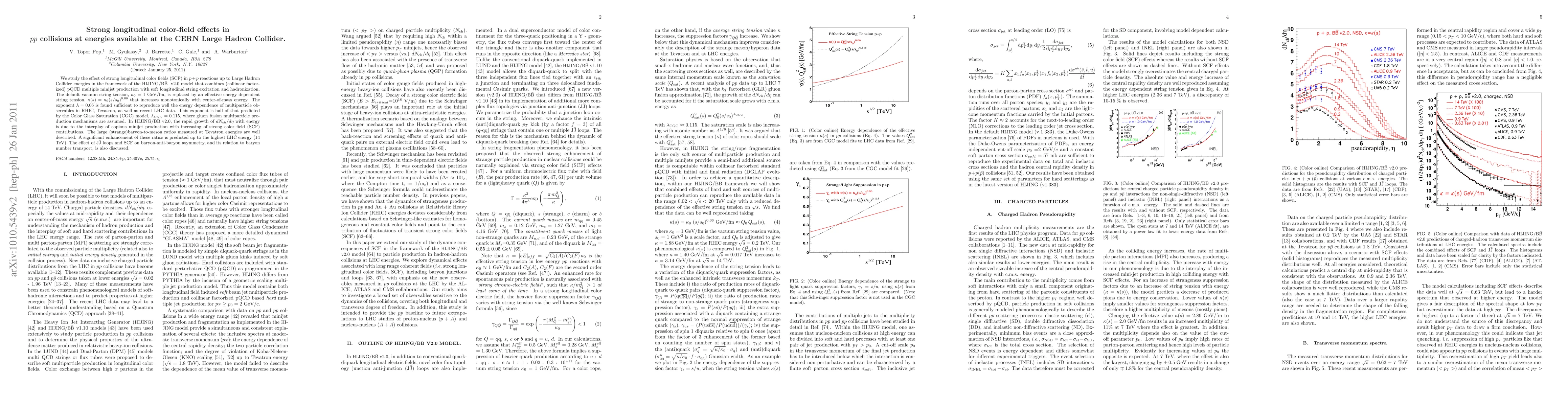 This paper investigates strong longitudinal color field effects in proton-proton collisions at the Large Hadron Collider using the HIJING/BBbar v2.0 model, finding that the exponent governing energy dependence is half that predicted by the Color Glass Saturation model. The model successfully reproduces multiparticle observables and predicts significant enhancements in baryon-to-meson ratios.