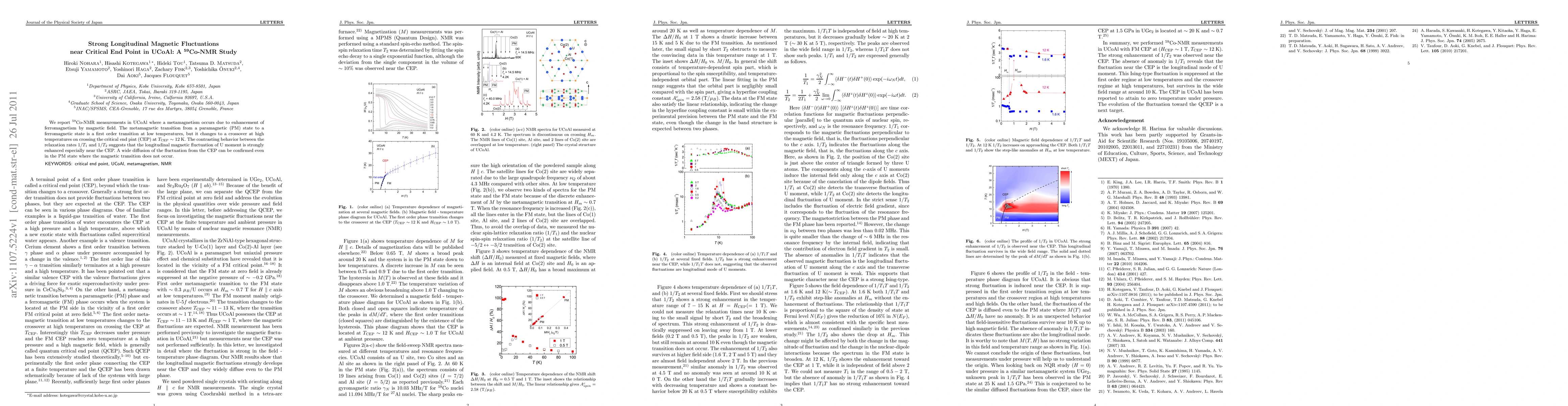 We report ^59Co-NMR measurements in UCoAl where a metamagnetism occurs due to enhancement of ferromagnetism by magnetic field. The metamagnetic transition from a paramagnetic (PM) state to a ferromagnetic state is a first order transition at low temperatures, but it changes to a crossover at high temperatures on crossing the critical end pint (CEP) at T_CEP ~ 12 K. The contrasting behavior between the relaxation rates 1/T_1 and 1/T_2 suggests that the longitudinal magnetic fluctuation of U moment is strongly enhanced especially near the CEP. A wide diffusion of the fluctuation from the CEP can be confirmed even in the PM state where the magnetic transition does not occur.