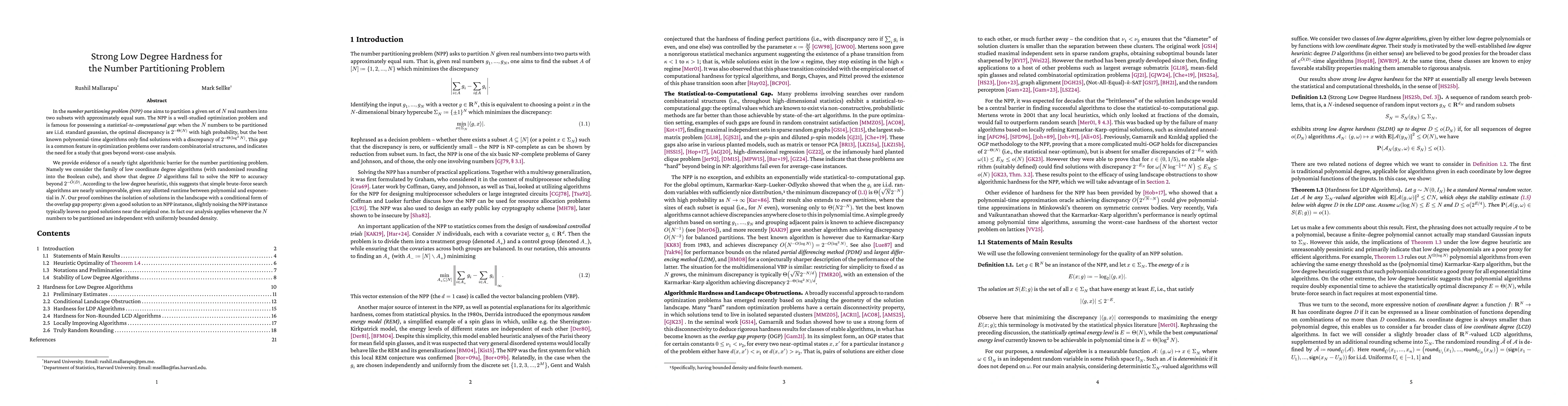 The work distinguishes itself by focusing on low coordinate degree algorithms and their limitations in solving the number partitioning problem, contributing to the understanding of computational complexity gaps in random combinatorial structures.