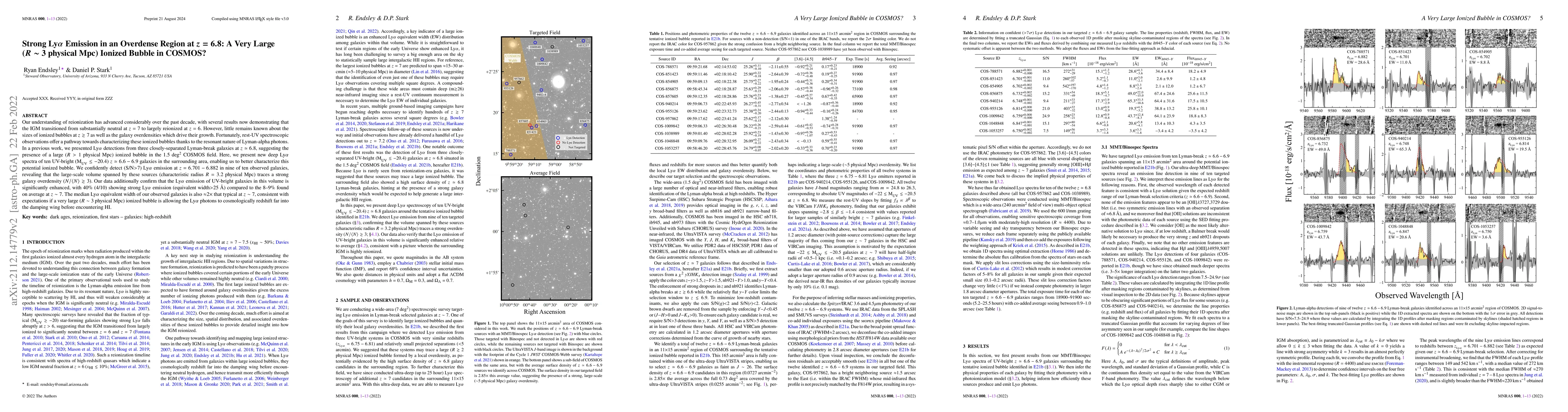 This paper reports the detection of strong Ly$\alpha$ emission in an overdense region at $z=6.8$, suggesting the presence of a very large ($R\sim3$ physical Mpc) ionized bubble in the COSMOS field. The study finds enhanced Ly$\alpha$ emission from UV-bright galaxies, indicating a significant galaxy overdensity and supporting the existence of a large ionized bubble.