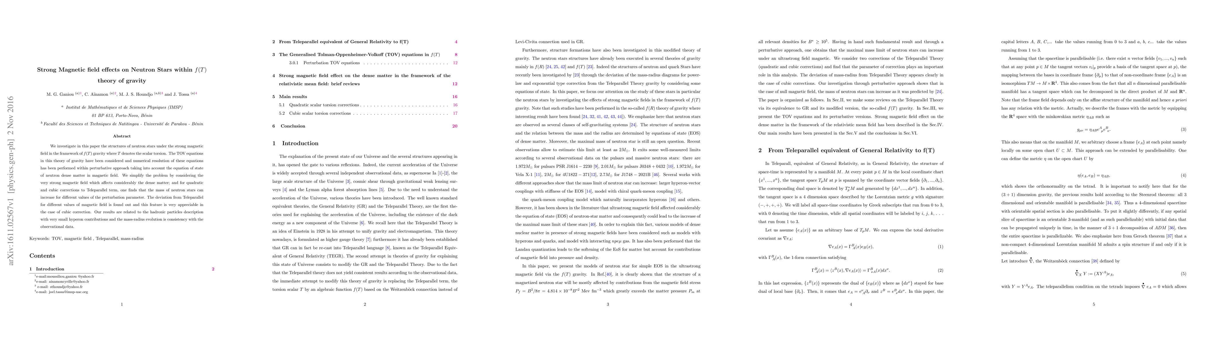 We investigate in this paper the structures of neutron stars under the strong magnetic field in the framework of $f(T)$ gravity where $T$ denotes the scalar torsion. The TOV equations in this theory of gravity have been considered and numerical resolution of these equations has been performed within perturbative approach taking into account the equation of state of neutron dense matter in magnetic field. We simplify the problem by considering the very strong magnetic field which affects considerably the dense matter; and for quadratic and cubic corrections to Teleparallel term, one finds that the mass of neutron stars can increase for different values of the perturbation parameter. The deviation from Teleparallel for different values of magnetic field is found out and this feature is very appreciable in the case of cubic correction. Our results are related to the hadronic particles description with very small hyperon contributions and the mass-radius evolution is consistency with the observational data.