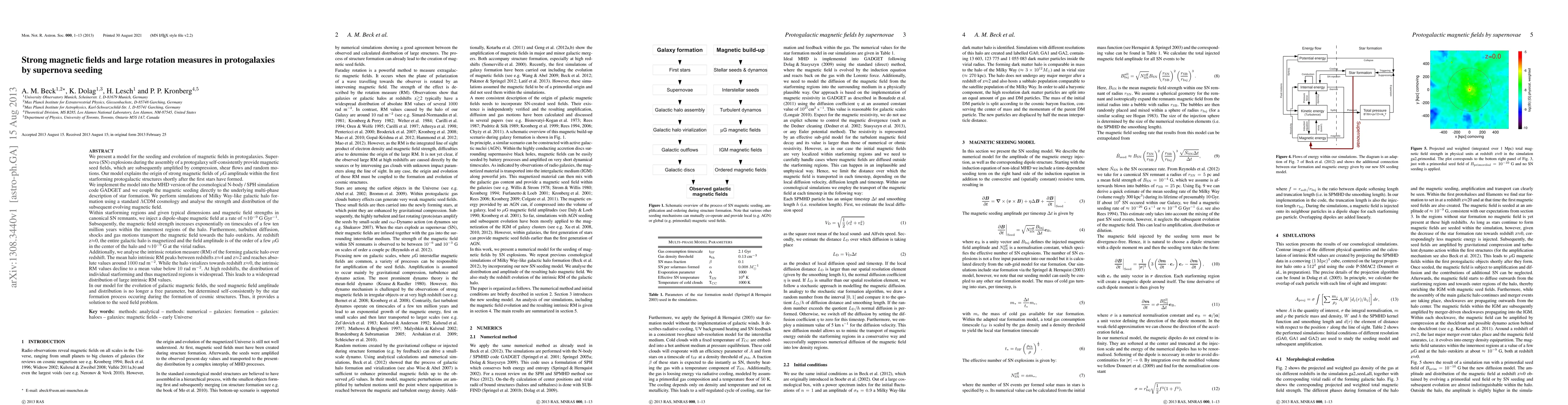 This paper models the development of magnetic fields in protogalaxies, attributing their initial seeding to supernova explosions. The study uses MHD simulations to show that these fields grow exponentially over time, reaching strengths of a few μG in the central galactic halo and 10^-9 G at the virial radius by z=0, while intrinsic rotation measures peak at around 1000 rad m^-2 between z=4 and z=2.