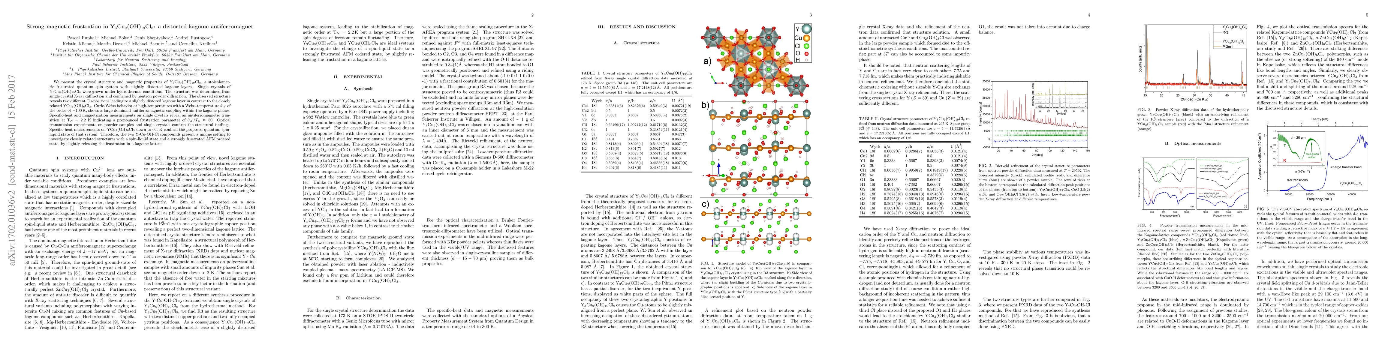 We present the crystal structure and magnetic properties of Y$_{3}$Cu$_{9}$(OH)$_{19}$Cl$_{8}$, a stoichiometric frustrated quantum spin system with slightly distorted kagome layers. Single crystals of Y$_{3}$Cu$_{9}$(OH)$_{19}$Cl$_{8}$ were grown under hydrothermal conditions. The structure was determined from single crystal X-ray diffraction and confirmed by neutron powder diffraction. The observed structure reveals two different Cu-positions leading to a slightly distored kagome layer in contrast to the closely related YCu$_{3}$(OH)$_{6}$Cl$_{3}$. Curie-Weiss behavior at high-temperatures with a Weiss-temperature $\theta_{W}$ of the order of $-100$ K, shows a large dominant antiferromagnetic coupling within the kagome planes. Specific-heat and magnetization measurements on single crystals reveal an antiferromagnetic transition at T$_{N}=2.2$ K indicating a pronounced frustration parameter of $\theta_{W}/T_{N}\approx50$. Optical transmission experiments on powder samples and single crystals confirm the structural findings. Specific-heat measurements on YCu$_{3}$(OH)$_{6}$Cl$_{3}$ down to 0.4 K confirm the proposed quantum spin-liquid state of that system. Therefore, the two Y-Cu-OH-Cl compounds present a unique setting to investigate closely related structures with a spin-liquid state and a strongly frustrated AFM ordered state, by slightly releasing the frustration in a kagome lattice.