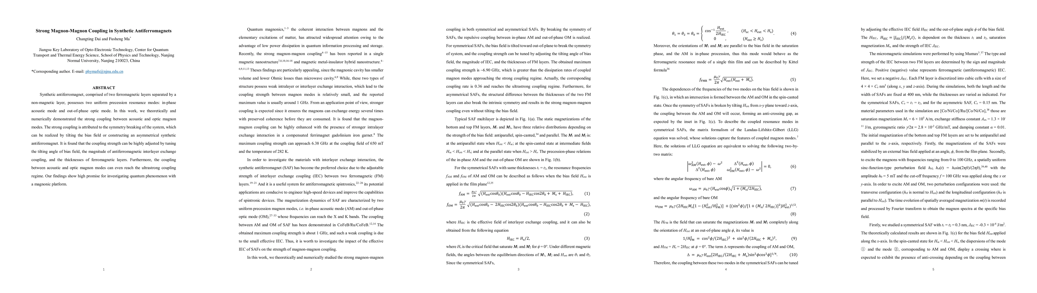 Theoretical and numerical demonstration of strong magnon-magnon coupling in synthetic antiferromagnets using two ferromagnetic layers separated by a non-magnetic layer.