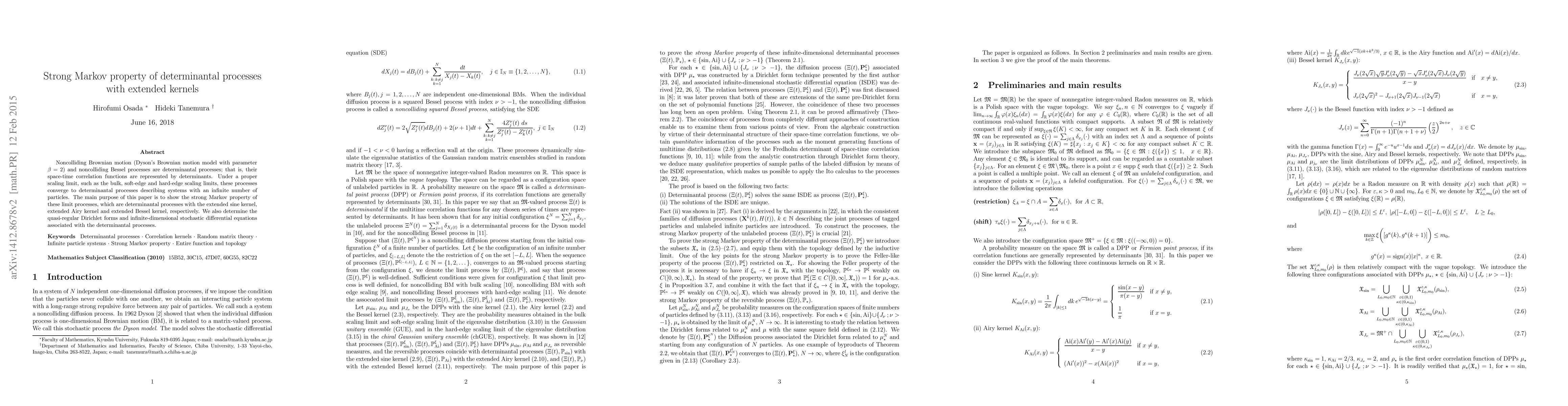 Noncolliding Brownian motion (Dyson's Brownian motion model with parameter $\beta=2$) and noncolliding Bessel processes are determinantal processes; that is, their space-time correlation functions are represented by determinants. Under a proper scaling limit, such as the bulk, soft-edge and hard-edge scaling limits, these processes converge to determinantal processes describing systems with an infinite number of particles. The main purpose of this paper is to show the strong Markov property of these limit processes, which are determinantal processes with the extended sine kernel, extended Airy kernel and extended Bessel kernel, respectively. We also determine the quasi-regular Dirichlet forms and infinite-dimensional stochastic differential equations associated with the determinantal processes.